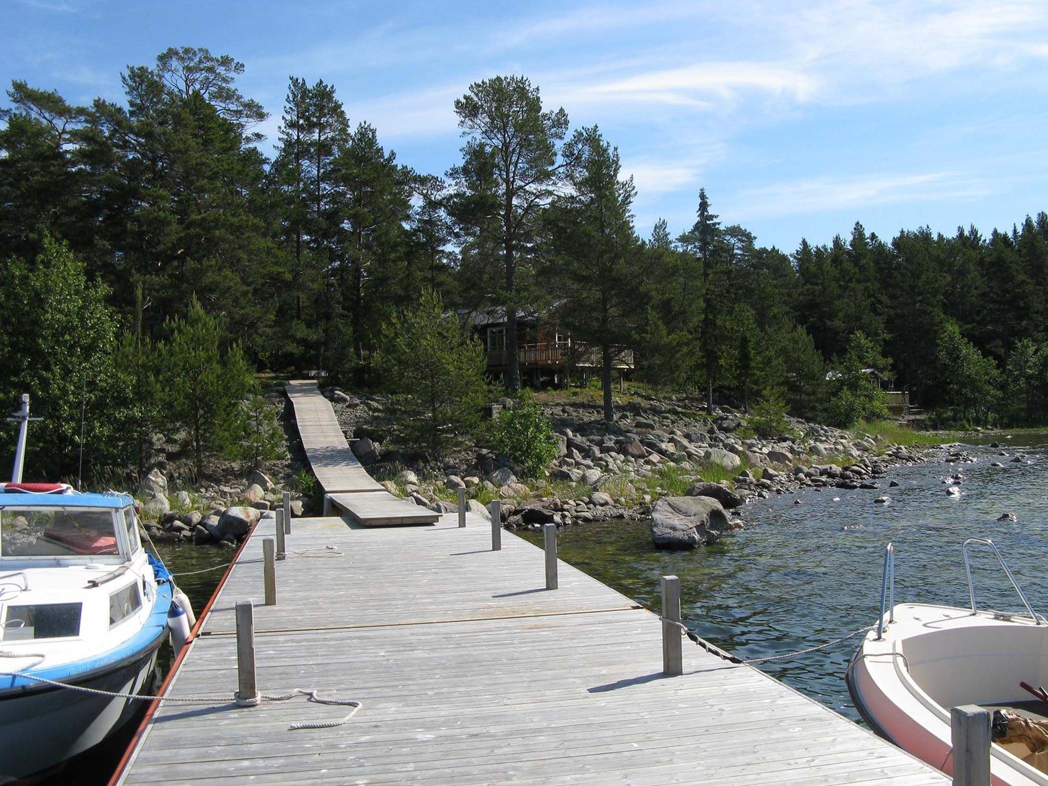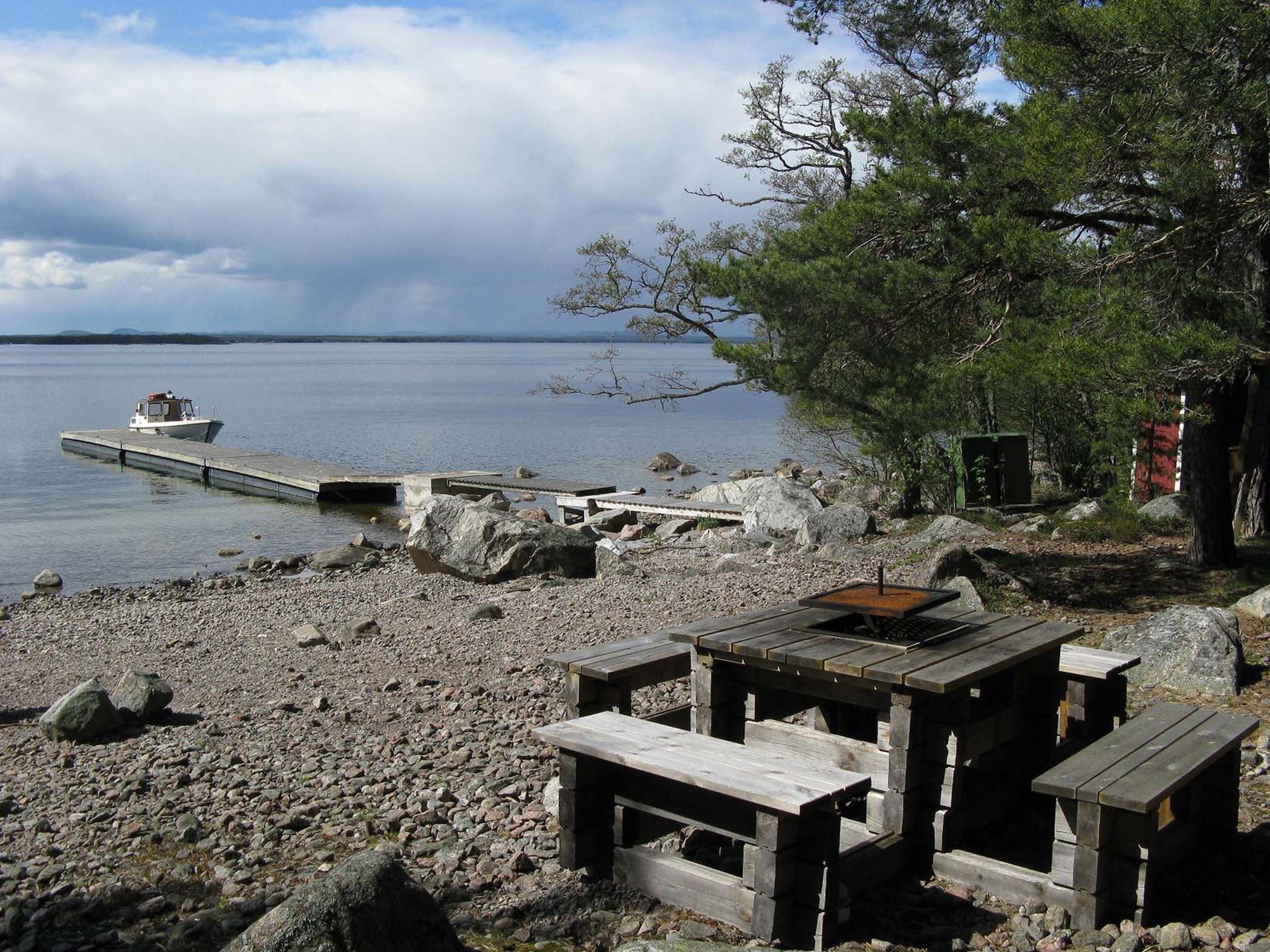 The charming cabins are located on the northwestern side of Storskären, close to the water, with a private jetty, a service building featuring an eco-toilet, a sauna, and a barbecue area. Just a few hundred meters from the cabins, there’s also a guest jetty, another toilet, and a barbecue area.