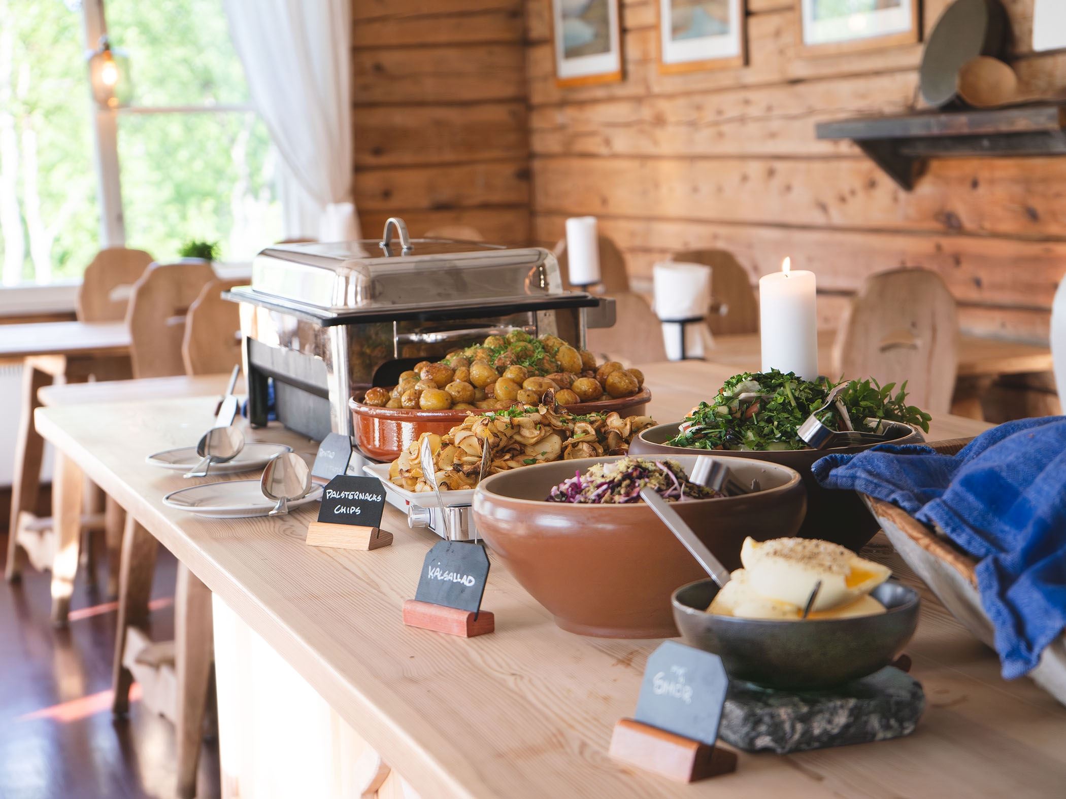 Our restaurant serves locally hunted game meat, char, and smoked whitefish from the lake below the station. Of course, we also always have good vegetarian and vegan options. If you'd rather cook your own food, we offer a well-equipped self-catering kitchen with a refrigerator to store your groceries during your stay.