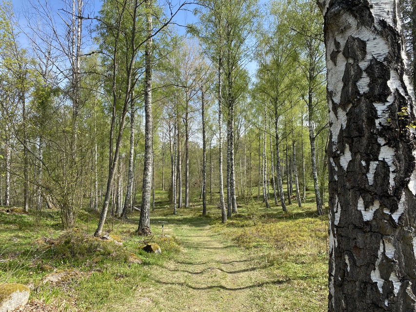 Ostkustledens början och går på grusvägar och skogsstigar längs ängar och