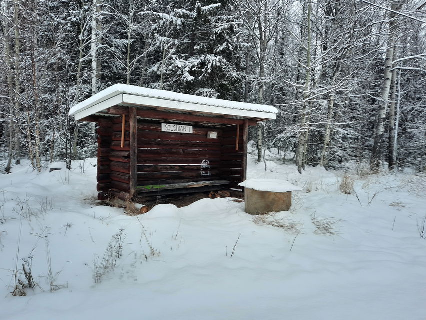 Vindskydd längs med motionsspåret. Här finns också en enklare grillplats. Ta med egen ved och släck elden efter dig!