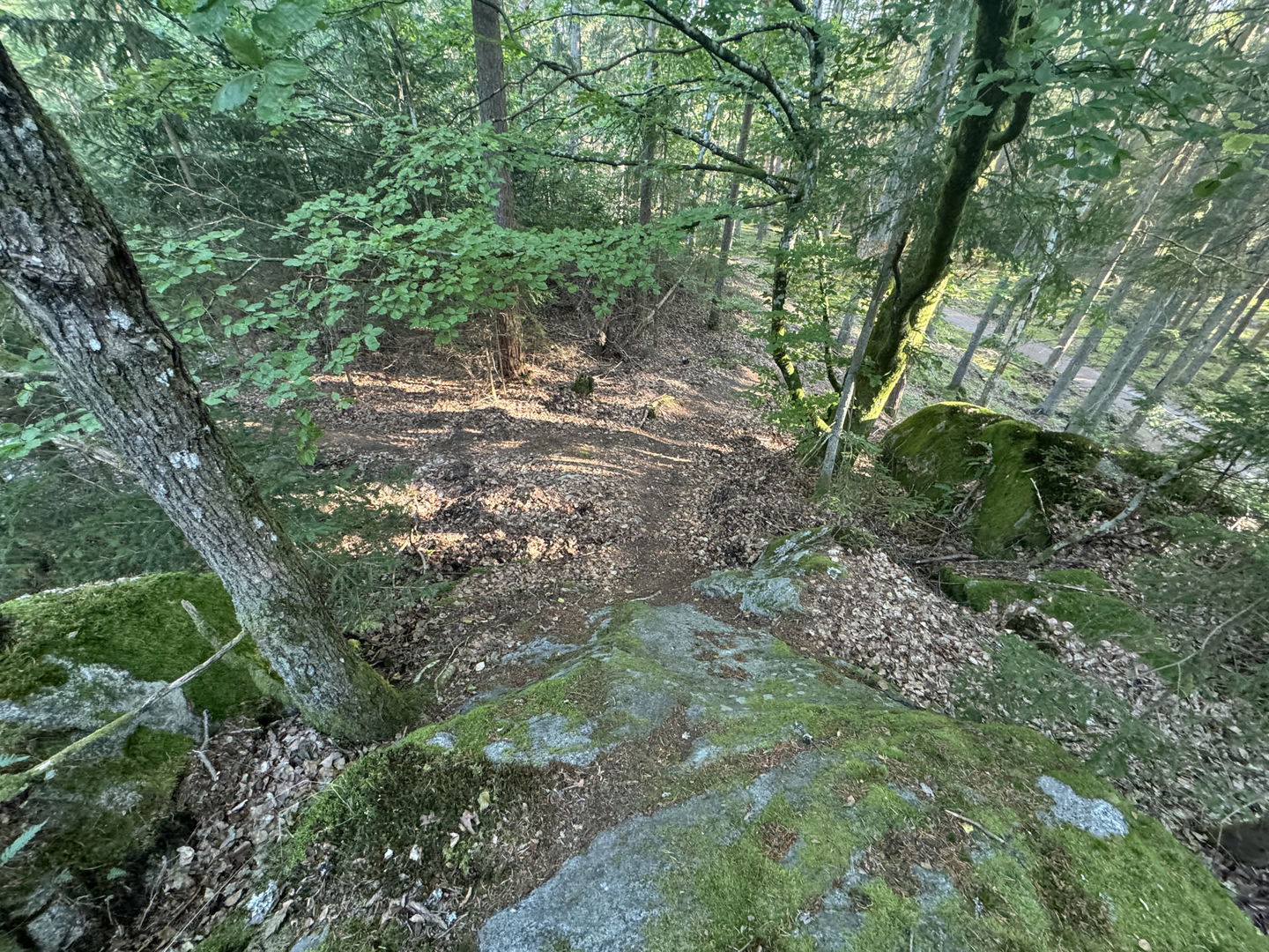 Ledmarkeringen är röd med nummer 5, ledgraderingen är Svår. Är du osäker på ett hinder, passage eller ledsträckning. Kör i ett lugnt tempo och ta det försiktigt. Det finns i regel olika vägval vid hinder, och varningsskyltar i gult är placerade i färdriktning för MTB-cyklister.