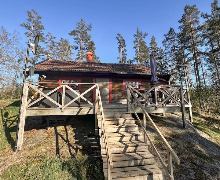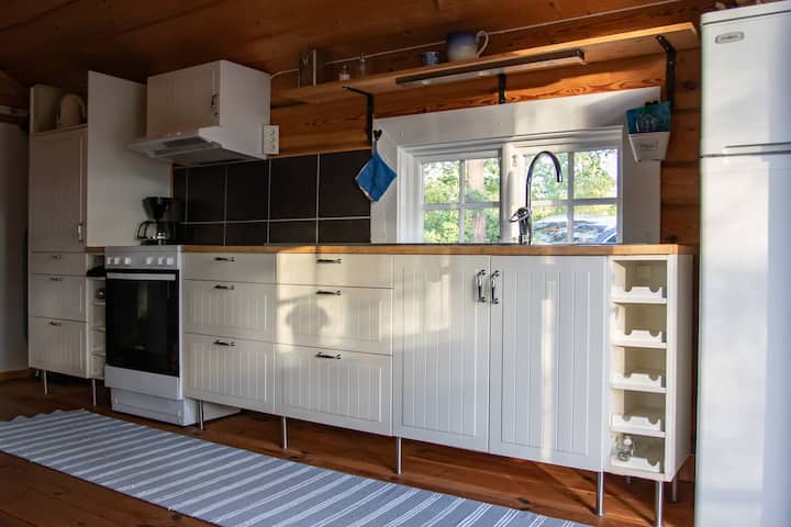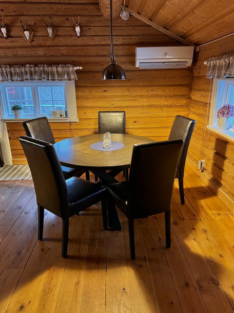 Inne i stugan finns även en mysig kamin man kan tända. Stugan erbjuder även en terrass med en grill, loungegrupp och matplats med utsikt över sjön. Parkering på baksidan av huset.