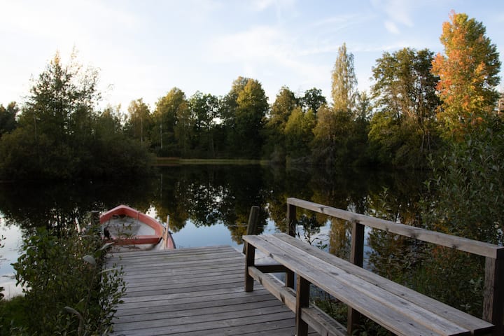 Välkommen att hyra en mysig timmerstuga i Dövestad, med en liten skogssjö precis utanför dörren.