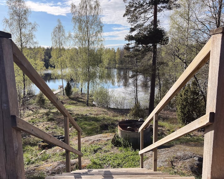 Timmerstuga med sjöutsikt
