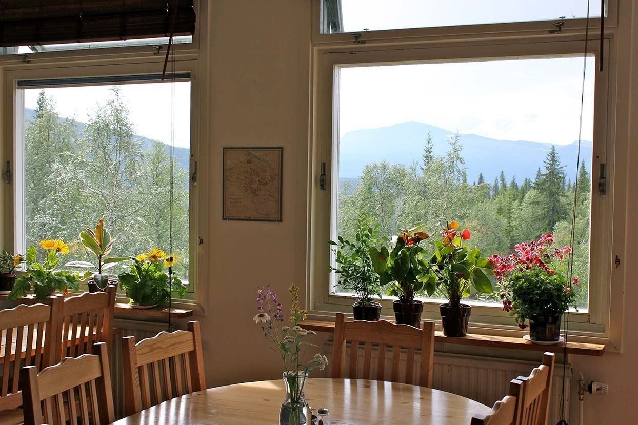 Restaurant In the restaurant, breakfast buffet, lunch, and an à la carte menu in the evening are served. The atmosphere is relaxed, and you can enjoy a fantastic view over the Kamajokk waterfall and the mountains in Tarradalen. Great care is taken in the choice of ingredients, with a focus on locally produced products such as game, berries, and Arctic char. After dinner, you can look out over the Sarek mountains from our beautiful "Common Room" in the old building from 1928.