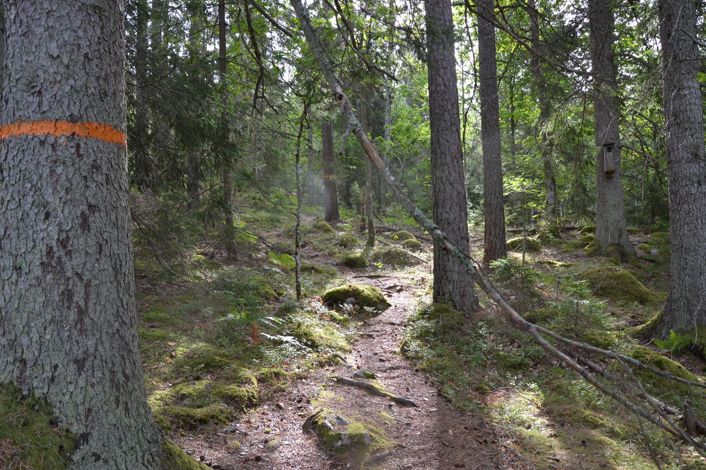 Leden går genom en av de största urskogslika skogarna i länet. Bland ståtliga gamla tallar på bergiga marker och ädla lövträd ner mot sjön är mångfalden stor och här lever ett stort antal speciella och ovanliga varelser. Vandringsleden går genom skogsmark och är vältrampad, men ganska krävande. Stigen går omväxlande lite uppför, genom flackare partier och sedan nedför. Det är dock absolut ingen ”klättring”.
