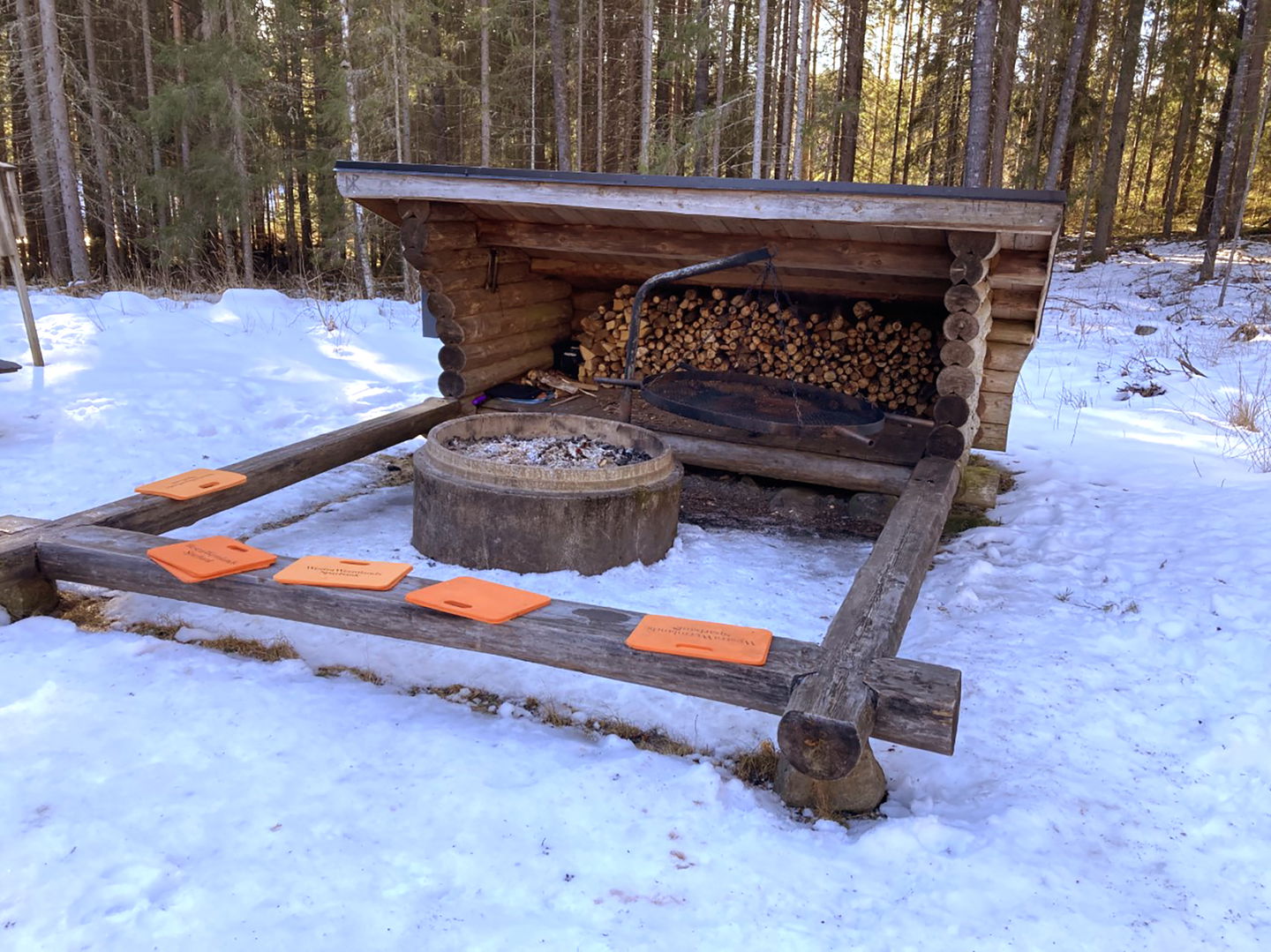 The distance from the parking lot to the Björnmyra cabin is 1,9 km. There are some bench tables.