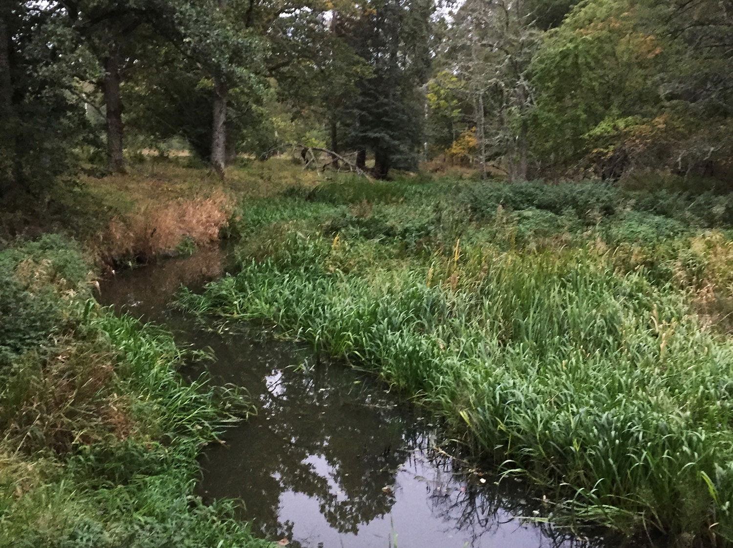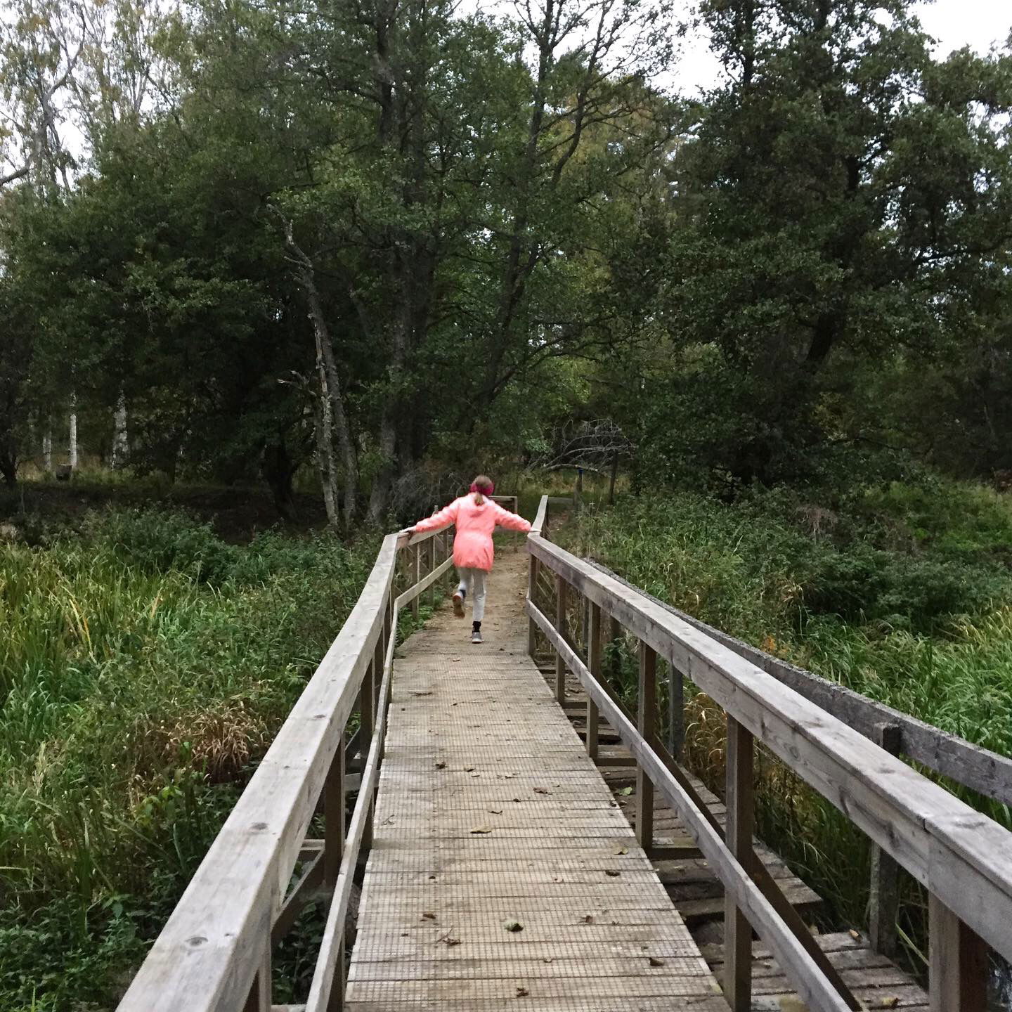 As you leave Hällekis behind, the landscape changes character. The path follows the winding stream through open pastures, leafy forest, and wooden footbridges.
