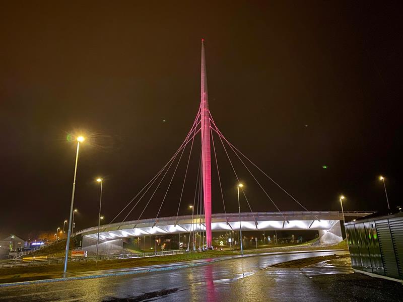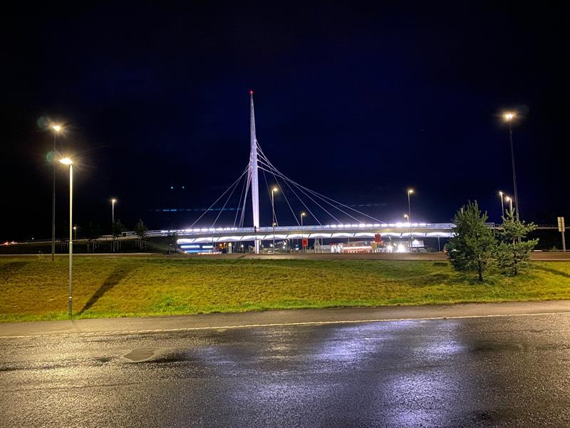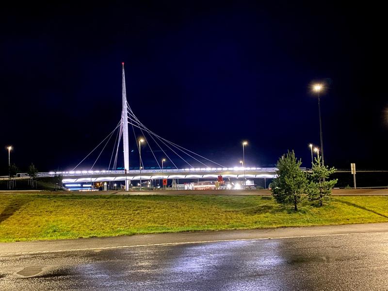 This bridge has become a landmark with its architecture. Made of steel and opened in 2017. Norgesporten bridge is an 80-metre-long lighted architect-designed suspension bridge. It hangs in a 52 meter high bridge tower through the center of Ørje and is part of the new E18.