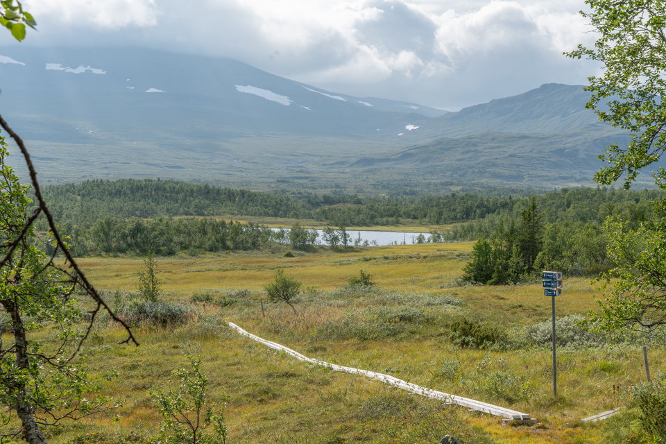 fjällateljé söder om Satsfjället. Vandrare och skidåkare längs Lapplandsleden