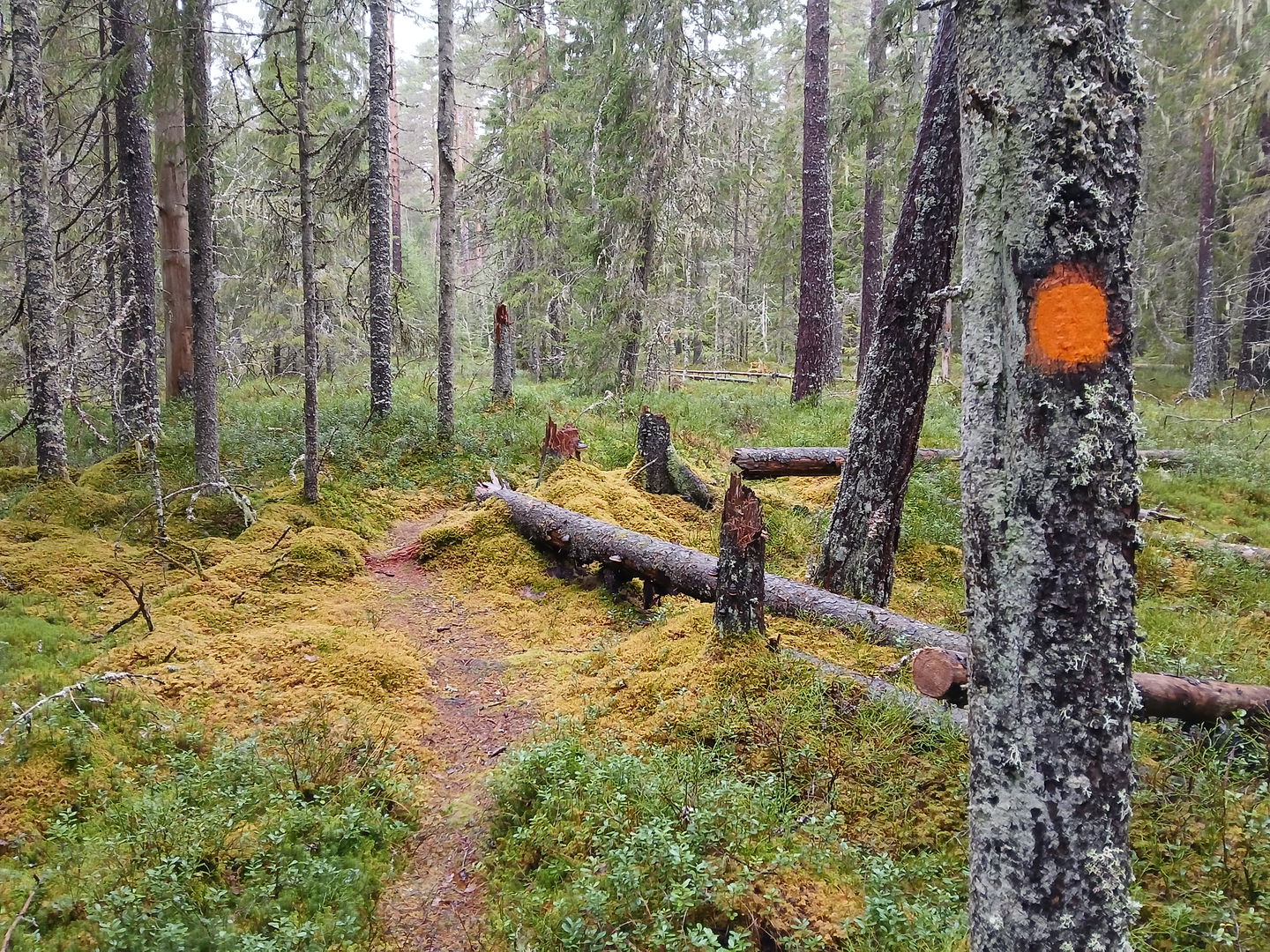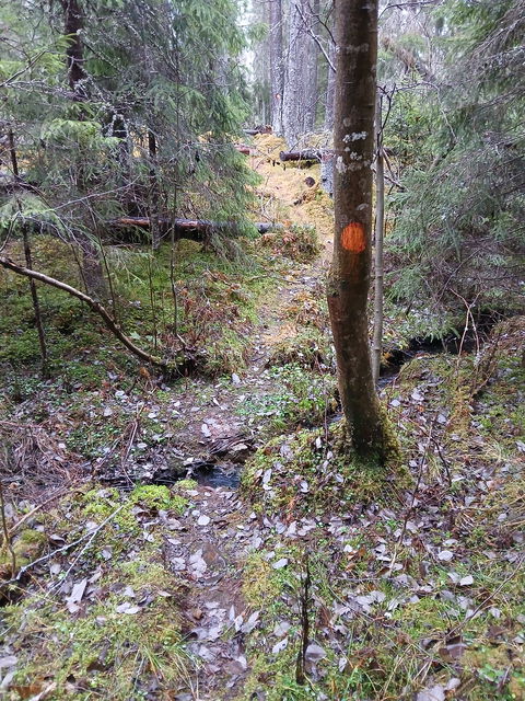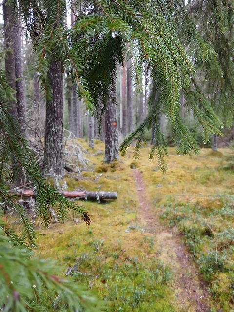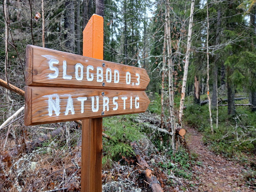 En märkt stig som leder genom delar av naturreservatet. Förbi slogboden och tydliga lämningar efter liggmilor. Stigen utgår från p-platsen