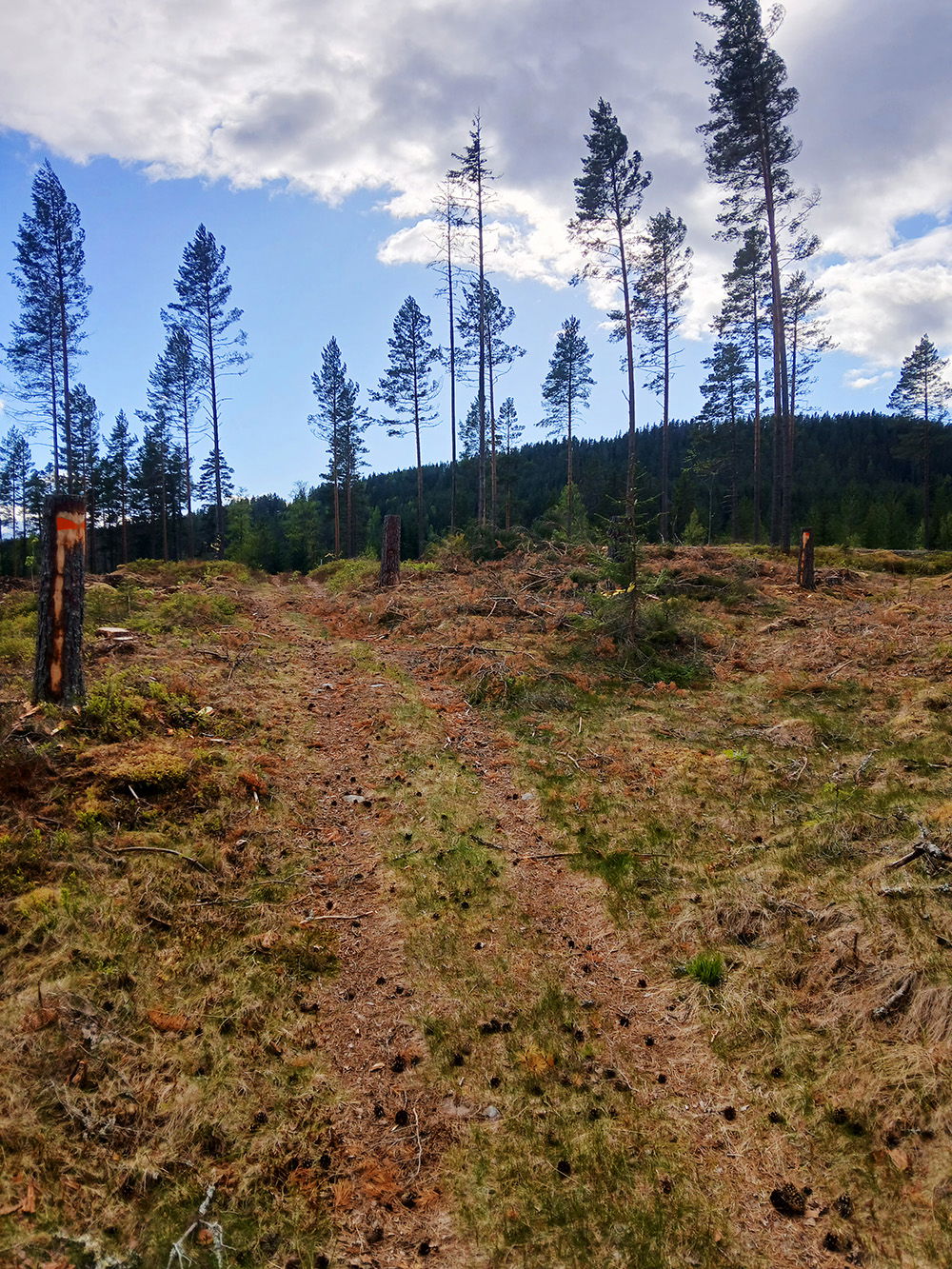 Gammal stig mellan Styrsjöbo och Erikhansbodarna (Jerkansbudan). Nya stora hyggen längs vägen ger vyer över nejden och en känsla för hur högt man faktiskt kommer upp när man går från Styrsjöbo.