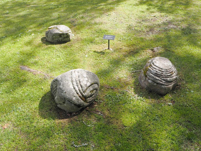 Tre låga, rundade grå naturstenar placerade i en triangel. Alla har sina egna mjuka, parallella linjer, huggna med mejsel.