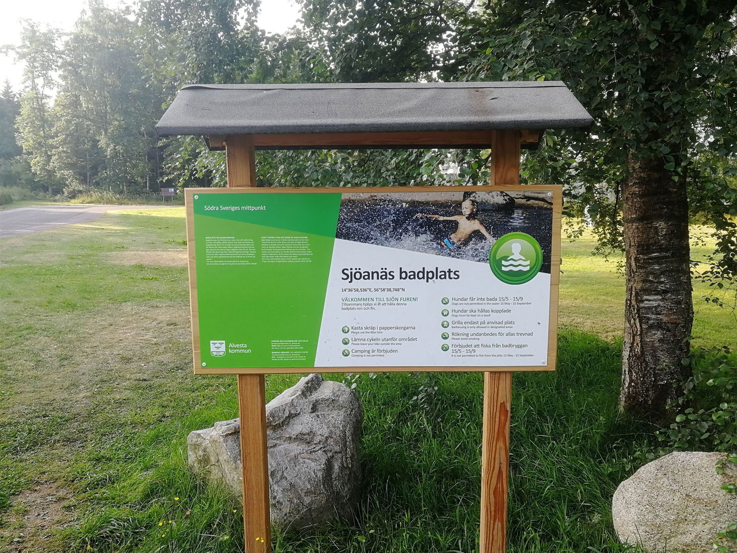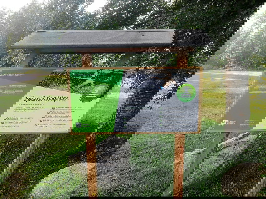 Välkomna till Sjöanäs badplats, En barnvänlig badplats men nära tillgång till grillplats, toalett och stor öppen yta om man vill roa sig med något annat än bad. Det finns en lång brygga med stege i änden och fin sandbotten