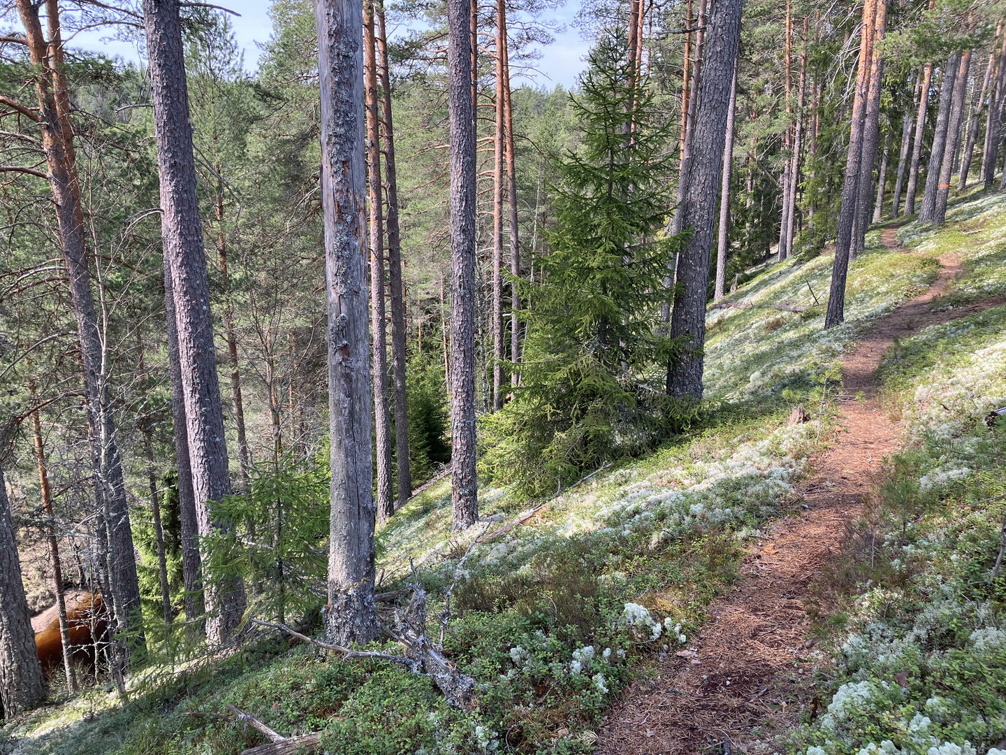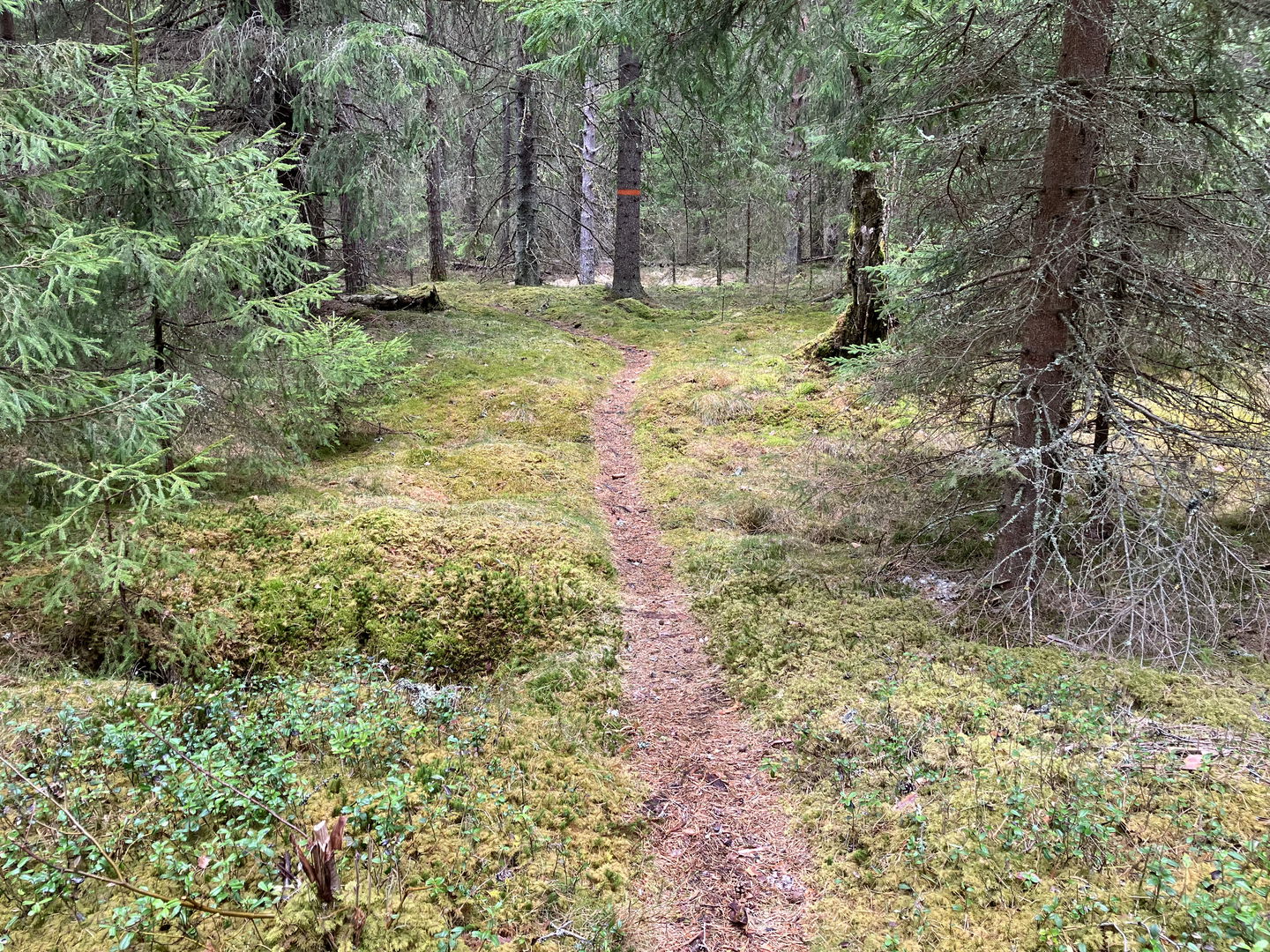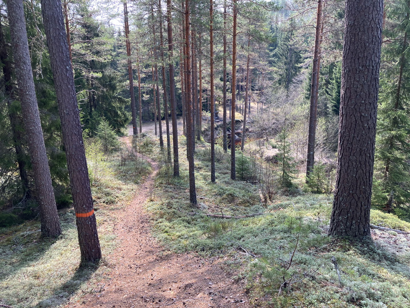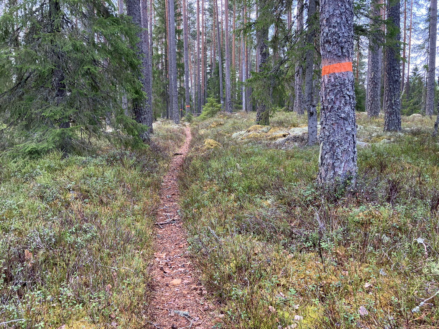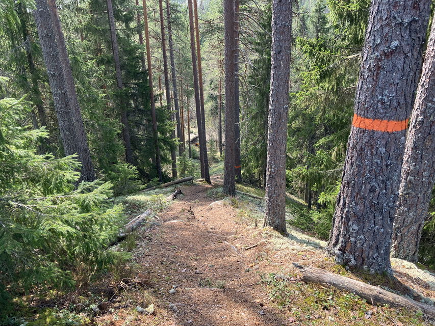 Orange markering på stolpar och träd