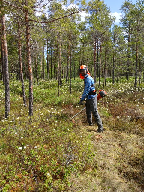 Naturstig genom nya naturreservatet Lômbackpojkanes NR. Området består främst av skvattramtallskog och myr. Man går längs djurstigar och nyröjda stråk och med tiden blir stigen förmodligen mer vältrampad. Längs vägen passerar man gamla torvtäkter som ser ut som fördjupningar i myren. Längre in i området finns många gamla och krokiga tallar.