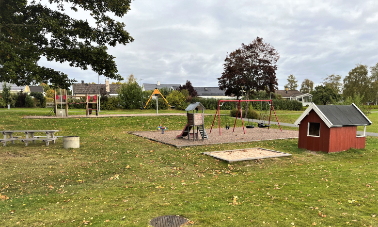 I grönområdet strax intill Vårdcenrum hittar du denna grillplats och lekplats. Här finns gungor, klätterlek, bänkar och bord.
