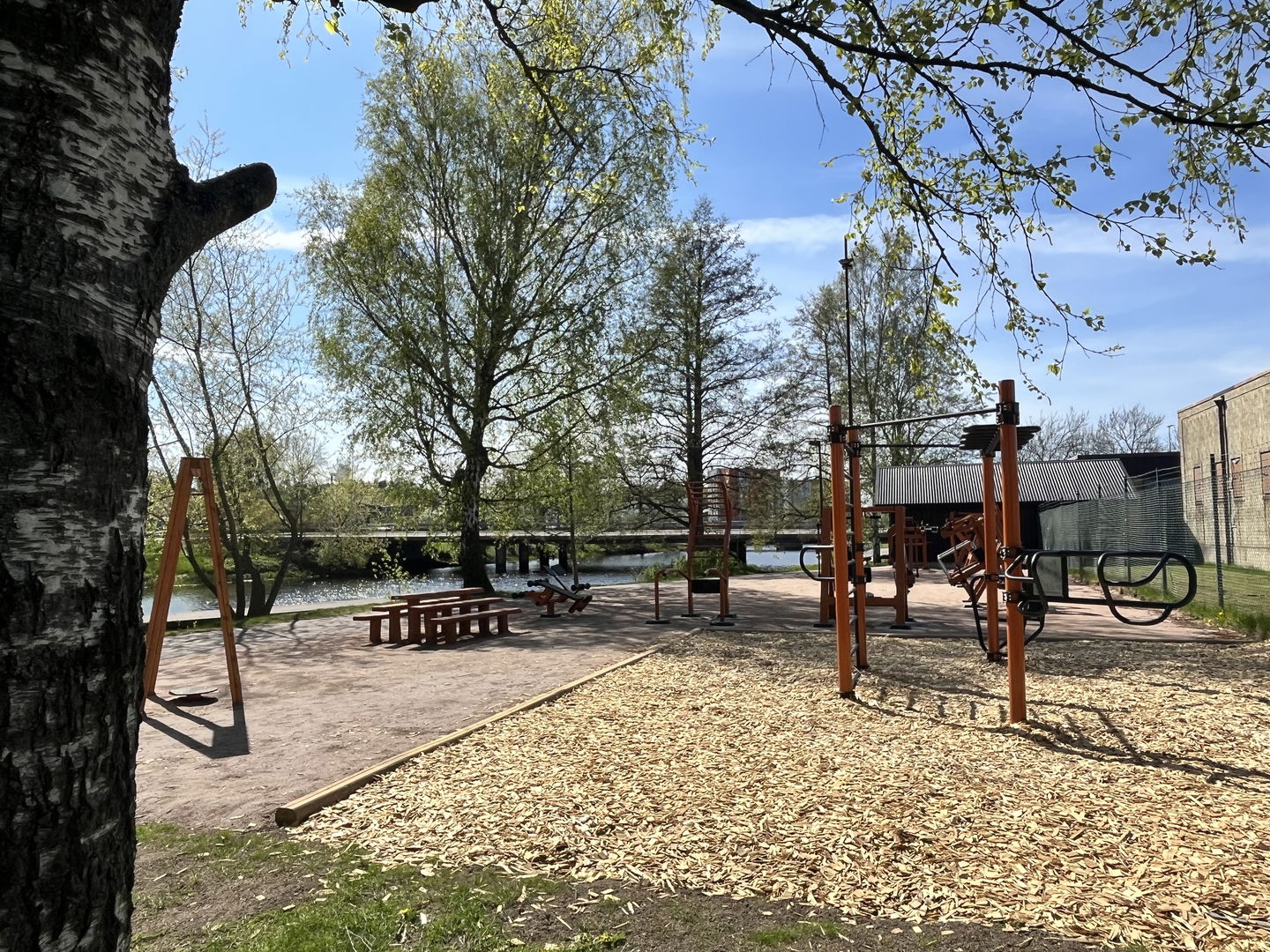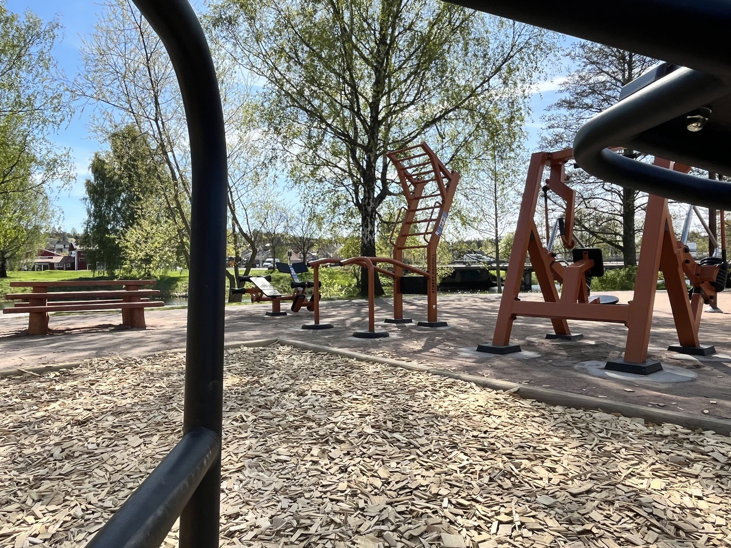 Bakom Räddningstjänstens station, med utsikt mot Varnan, hittar du ett stort och inbjudande utegym med hela tio stationer. Här kan du träna styrka, rörlighet och kondition – och några av stationerna går att använda på flera sätt för ännu fler möjligheter.