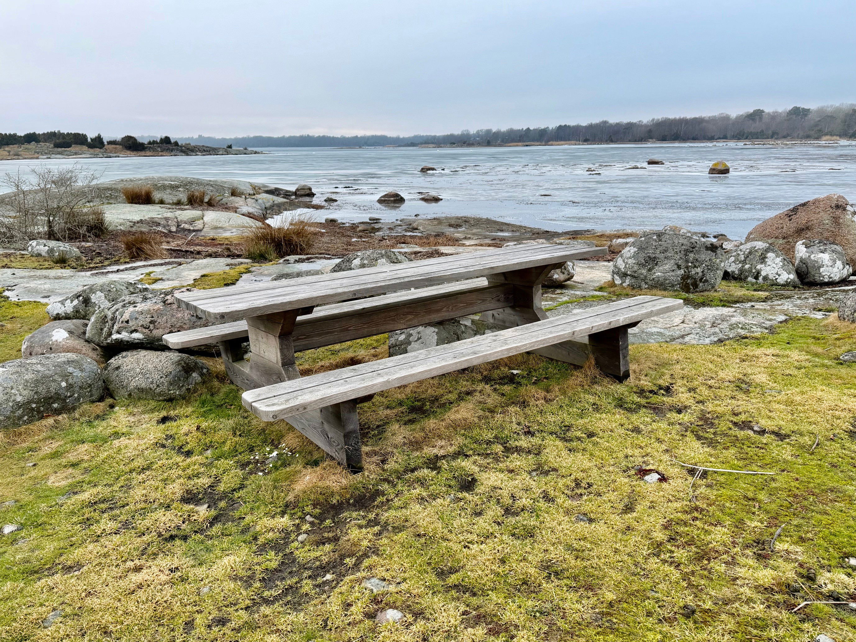 Bänkbord på berghäll innanför Sysslingaholmen. Ligger i närheten av Almö udd leden.