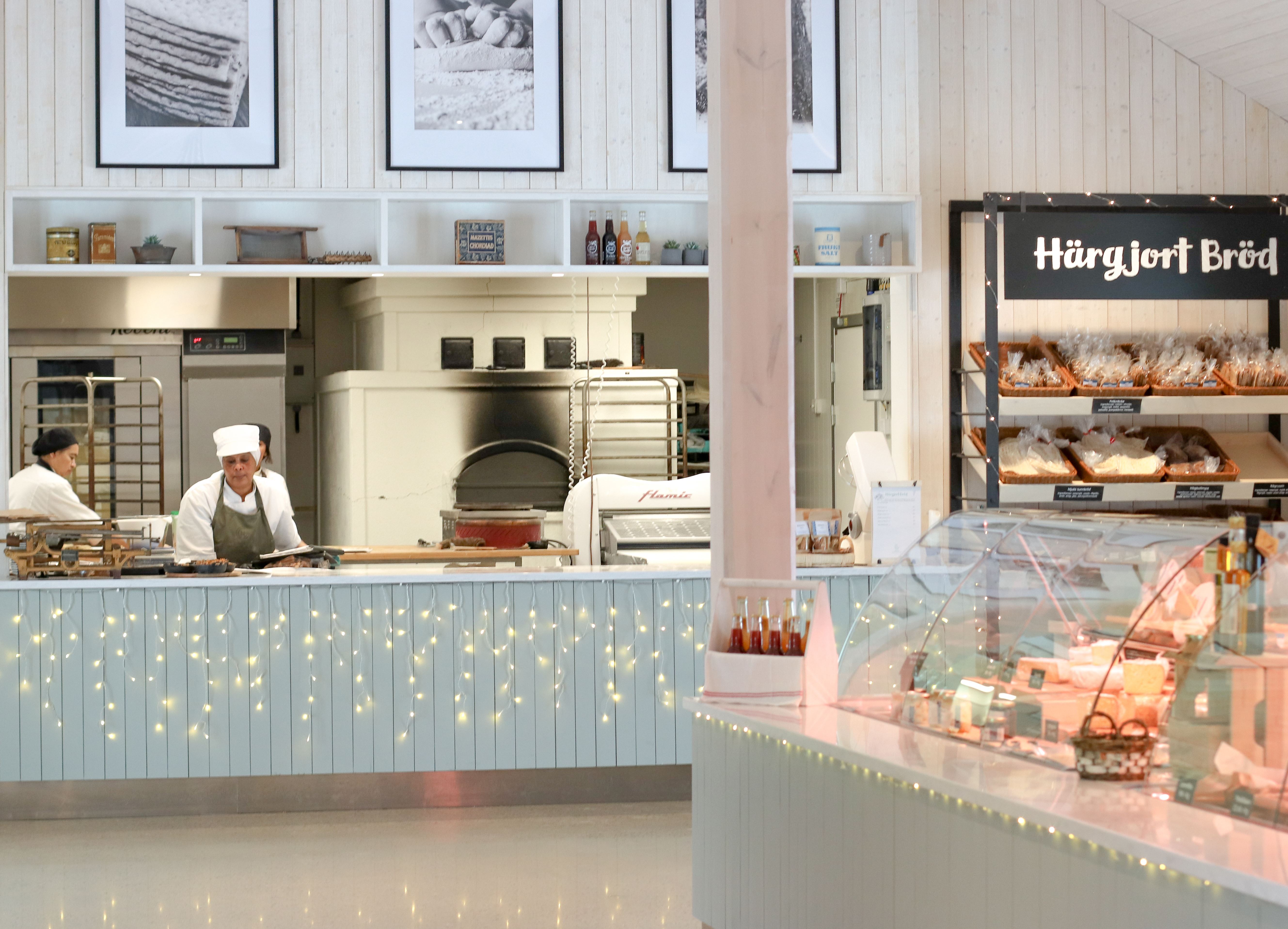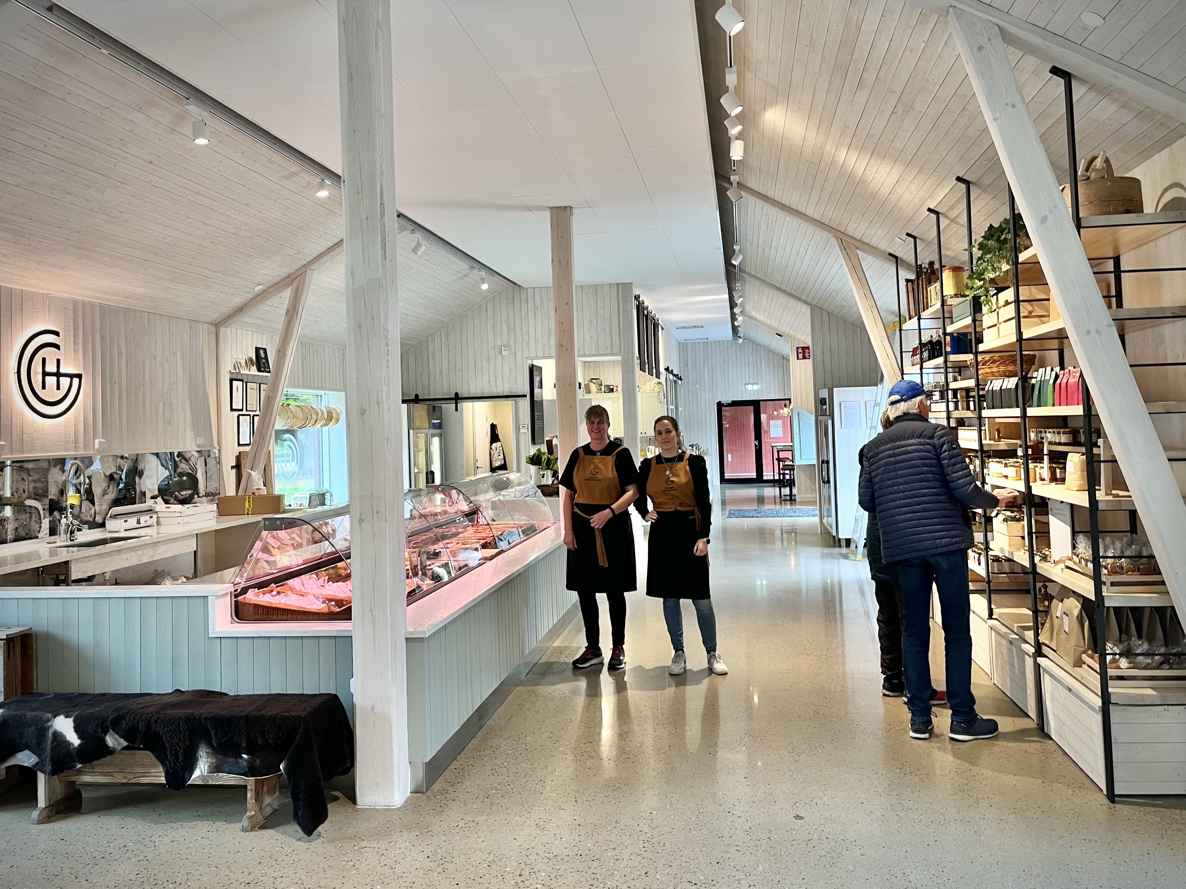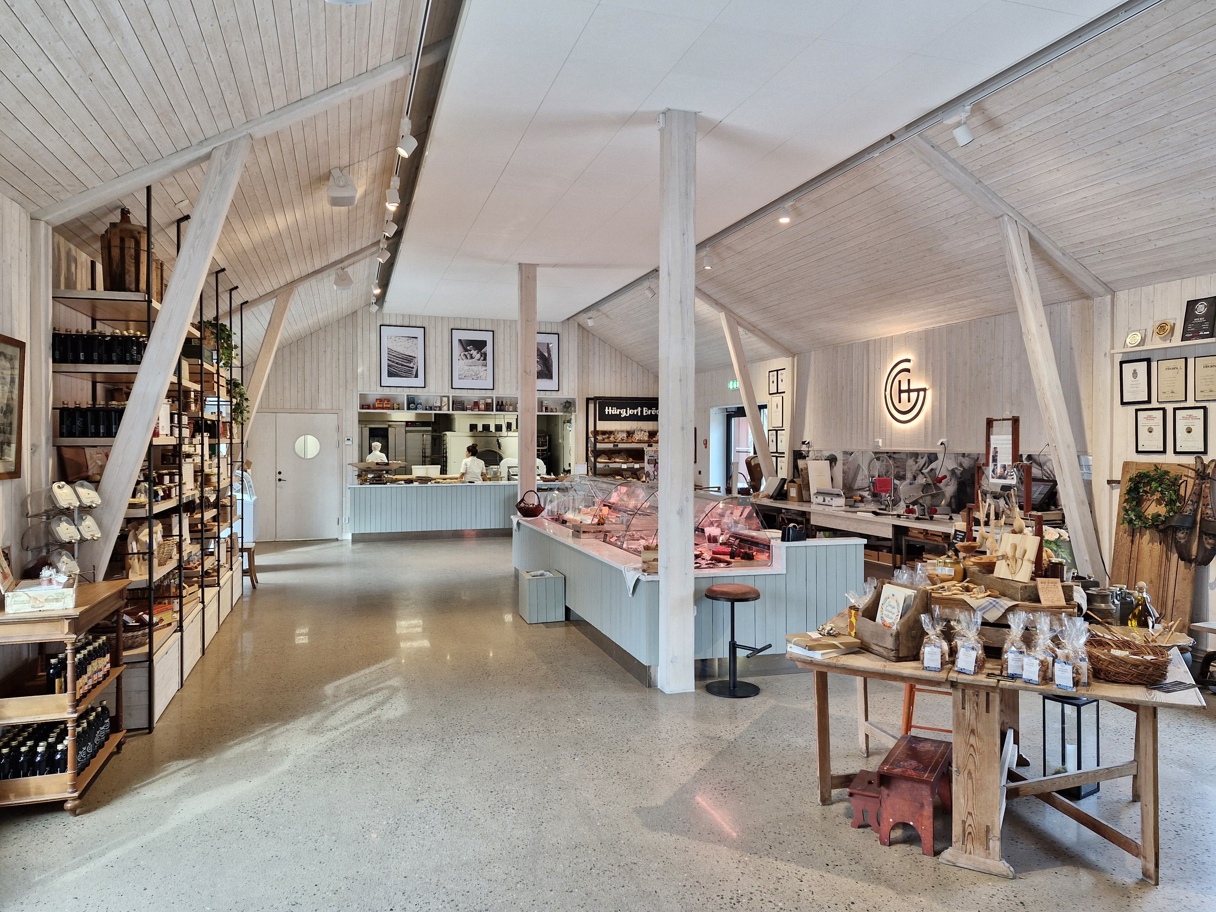 I samma byggnad finns ysteri, bageri och charkuteri. Kika gärna in genom de stora fönstren så kan du se hur produktionen går till.