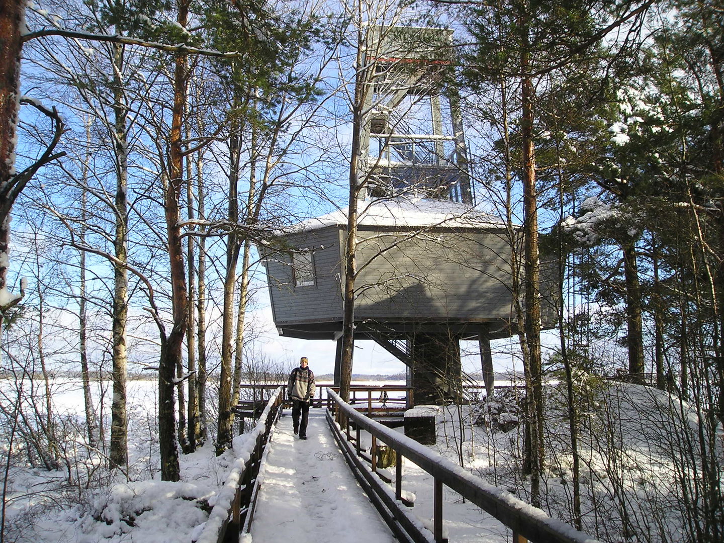 Stora fågeltornet ligger i anslutning till huvudentrén, det är 12 meter högt med en härlig utsikt över Kävsjön och gungflyet. Första våningen är tillgänglig för rullstolar och det finns även en hiss till andra våningen. Där finns en utställning om Kävsjön och dess djurliv och skötsel och en vevbar mp3-spelare med fågelljud. För att komma högre upp i tornet är det bara trappor som gäller. Glöm inte kikaren.