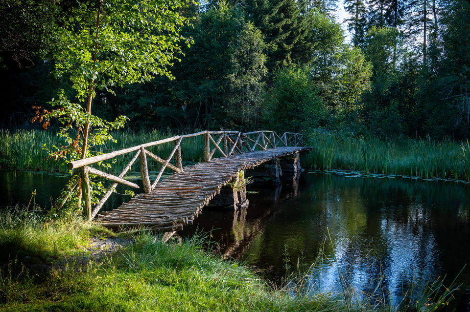Den smäckra och minst sagt unika bron över Tidan är byggd av senvuxna slanor av gran. Mitt på bron finns en sittbänk där du kan njuta av den fina vyn mot Corps de logi. Hjalmar Hurtig på Ryfors byggde Pinnabron i början av 1900-talet.
