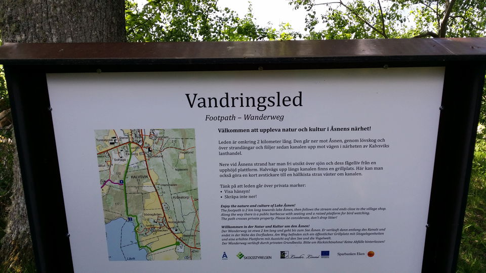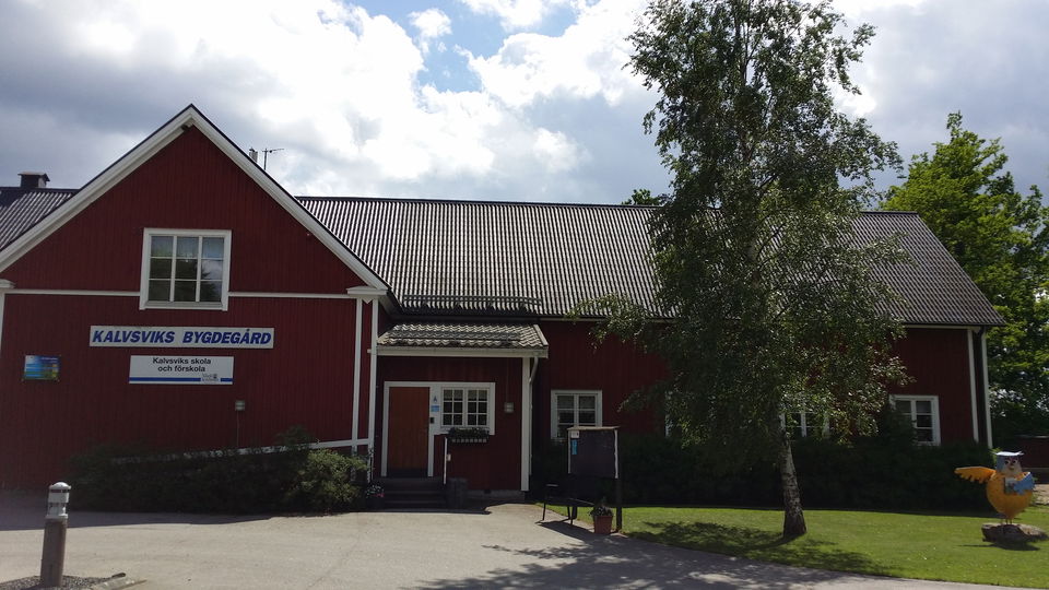 Stor asfaltsparkering vid Kalvsviks bygdegård. Här finns information och start för Kalvsviks vandringsled.