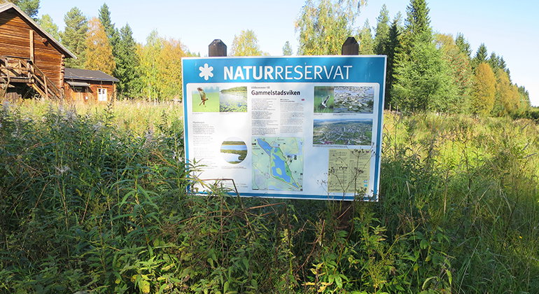 Informationsskylt som står vid parkeringsplatsen intill friluftsmuseet Hägnan, där leden till Gammelstadsviken börjar.