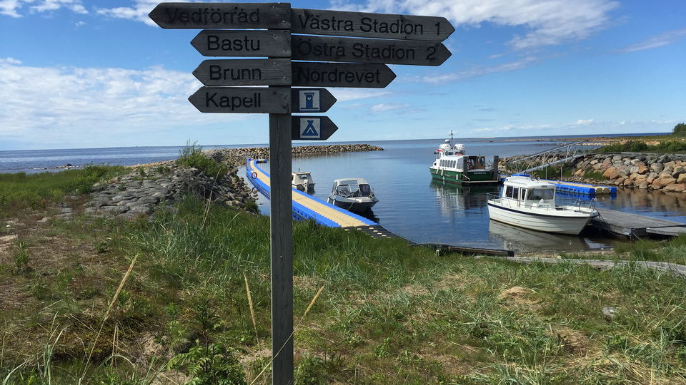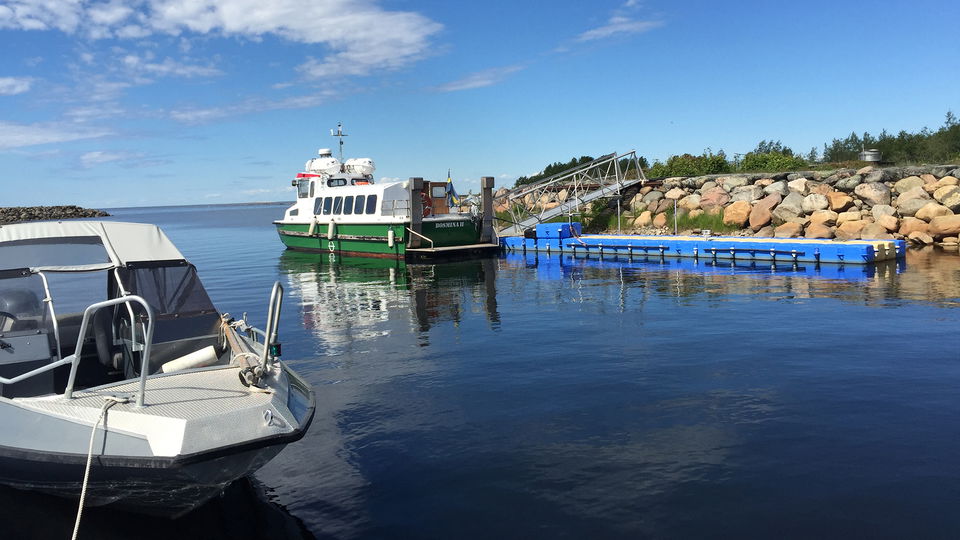 En hamn med flytbryggor där gästande båtar och turbåten lägger till.