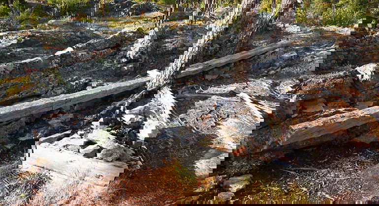 Eldstad och enkel bänkstock i dåligt skick vid Laisälven.