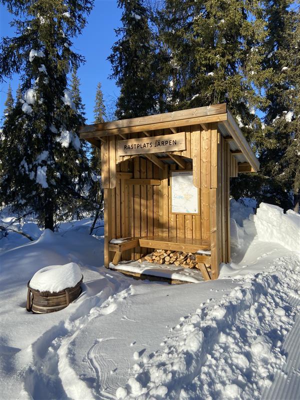 Vindskydd i närheten av kommunrundan med sittbänk och möjlighet att elda. Utsiktsglimtar mot Dundret och skog i södersluttning.