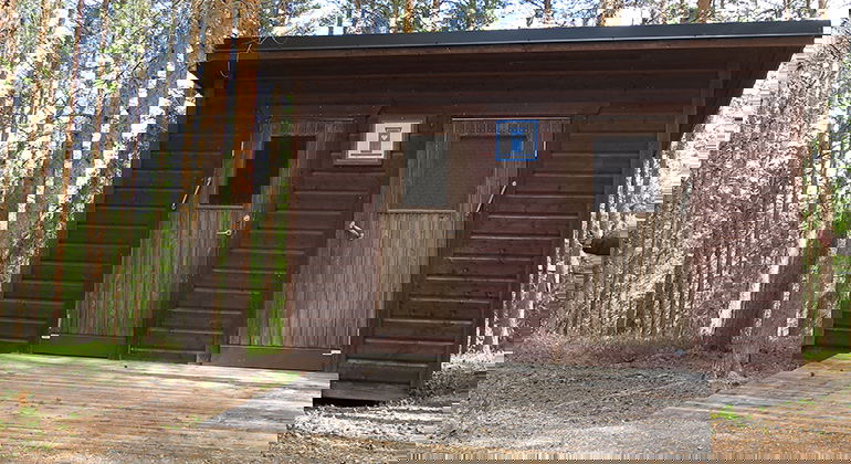 Ett dubbelt dass vid parkeringsplatsen. Det ena rummet är större och tillgänlighetsanpassat. Plan yta saknas dock utanför dörren.