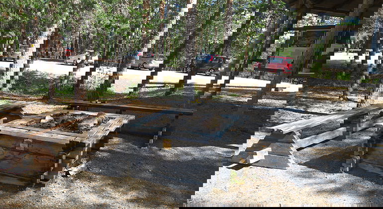 Grillplats med eldstad och bänkar. Bänkarna är i behov av upprustning.