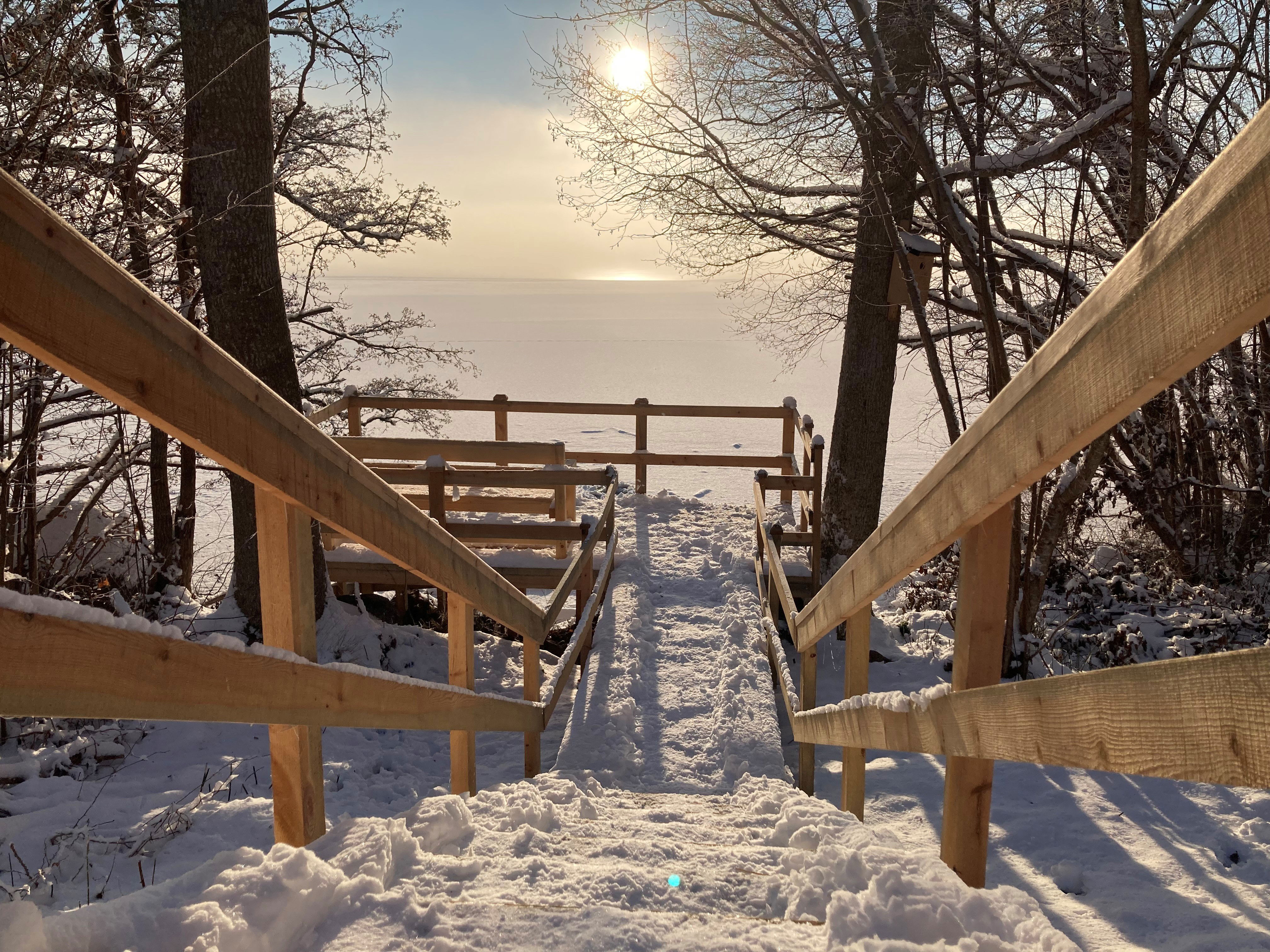 Parkera vid östra parkeringen och följ grusvägen ner till den öppna gräsytan där man kan ta sig ner frö trappan och ner till utkiksplattformen.