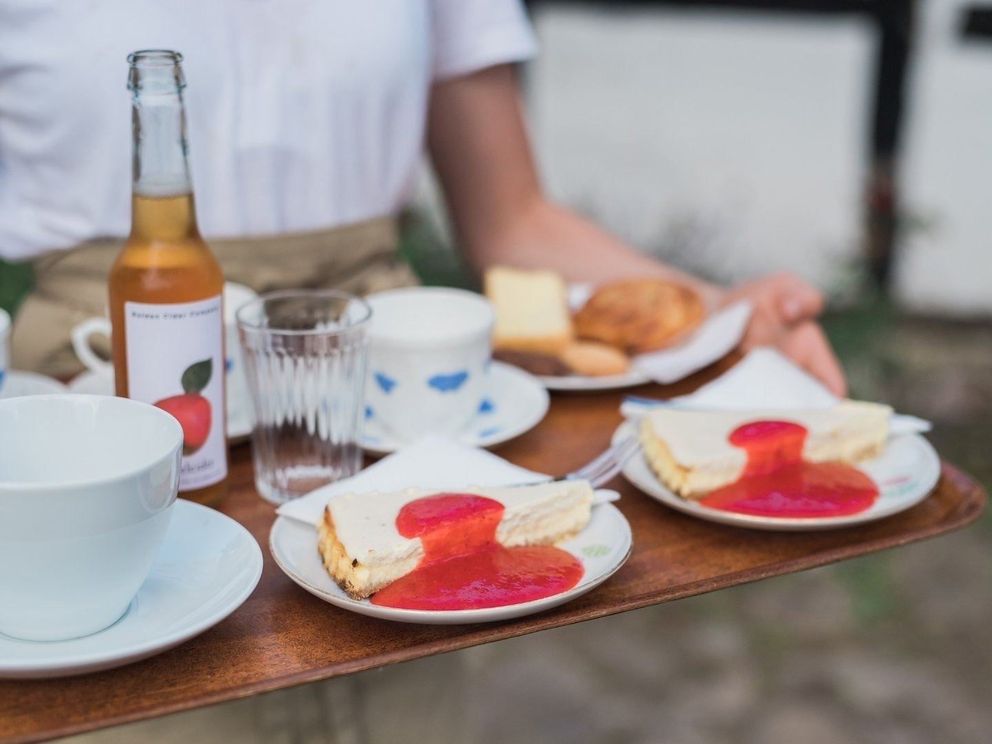 Utanför husen väntar den prunkande trädgården med grillplats. Under dagtid är kaffestugan öppen och fylld av liv och sorl, medan lugnet lägger sig över platsen på kvällen och du kan njuta av stillheten och naturens närhet.