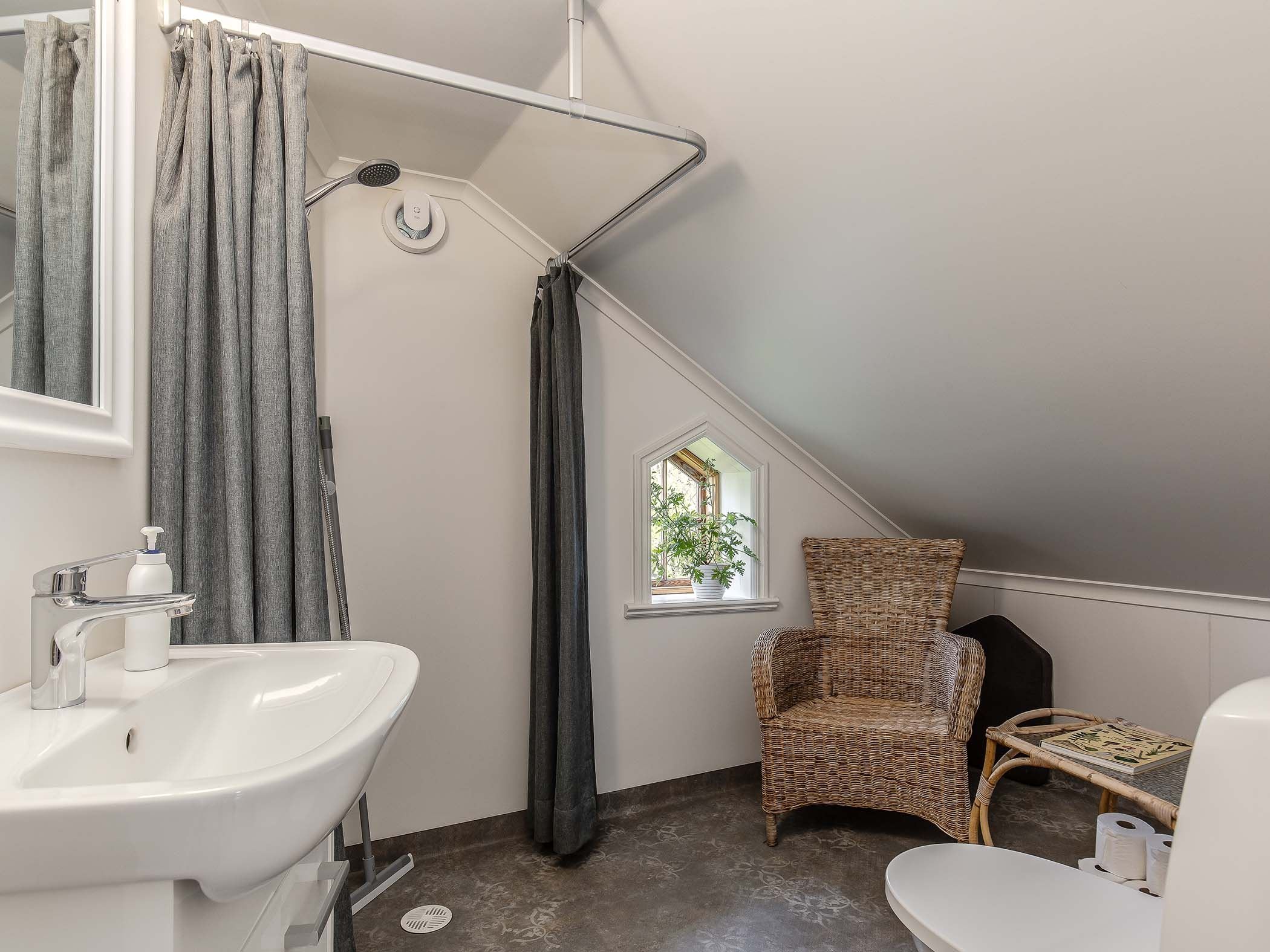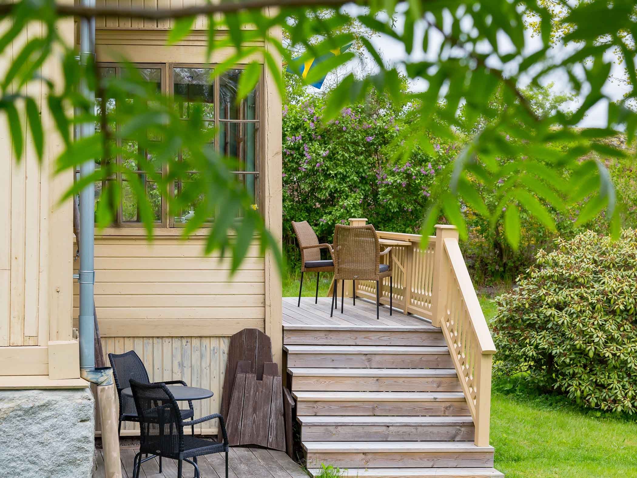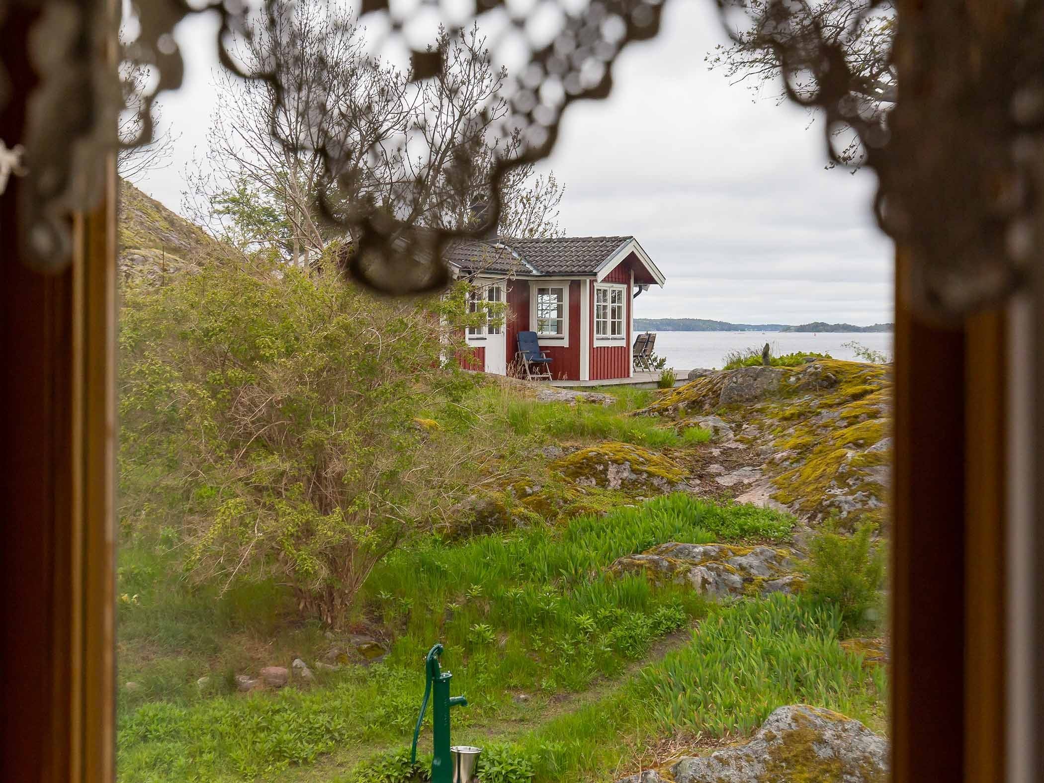 Utöver rummen i handlarvillan finns en egen skärgårdsstuga på berget bakom som hyrs ut till ett sällskap (2–4 personer) i taget. Härifrån har ni utsikt i tre väderstreck över fjärden och nära till bastun och badbryggan. Stugan har ett eget kök och toalett (medan dusch finns i ett separat hus på gården) samt en egen veranda med sittgrupp där ni kan njuta av fantastiska solnedgångar över Sandöfjärden.