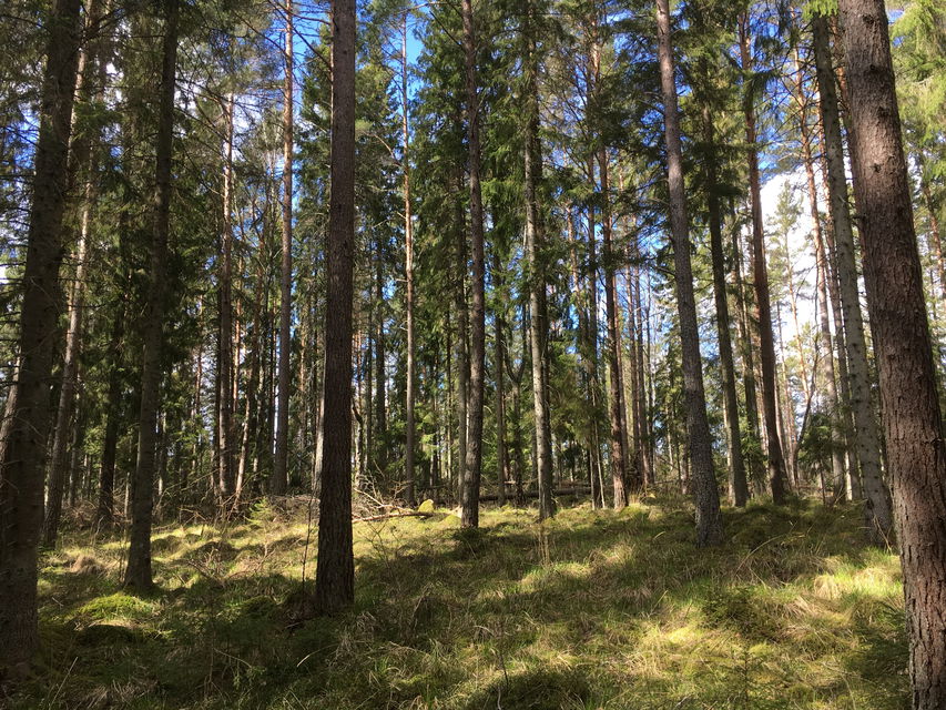 I öster minskar barrträden och skogen övergår till allt fler lövträd som björk och sälg - en påminnelse om att landskapet varit mer öppet. Förr var det här åker och äng som brukades av bonden. Skogen betades av prästgårdens djur.