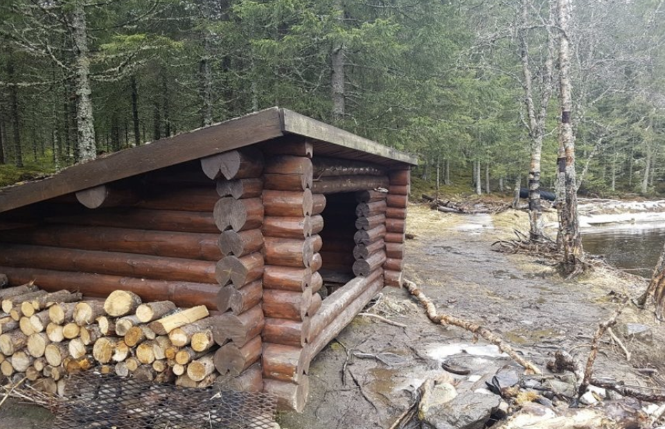 Rastplats ca 300 m från leden. Gå över hängbron och följ stigen genom skogen. Här finns vindskydd, bänkar, eldstad och ved.