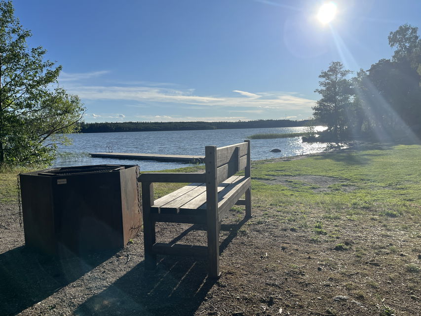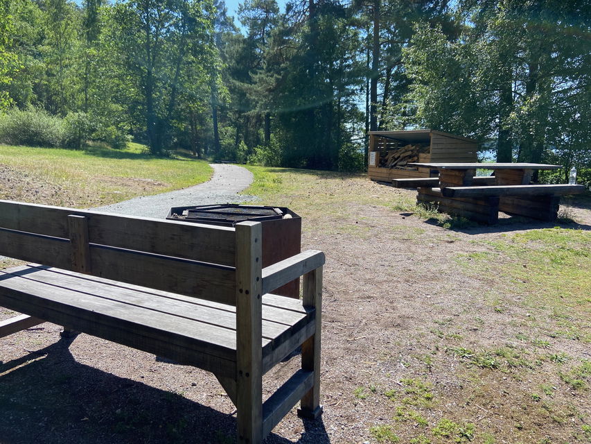 Grillplats med en högre grill och tillgänglighetsanpassat rastbord. Från parkeringen vid Blåhäll går en hårdgjord stig fram till platsen. Intill grillplatsen finns ett stort vedförråd.
