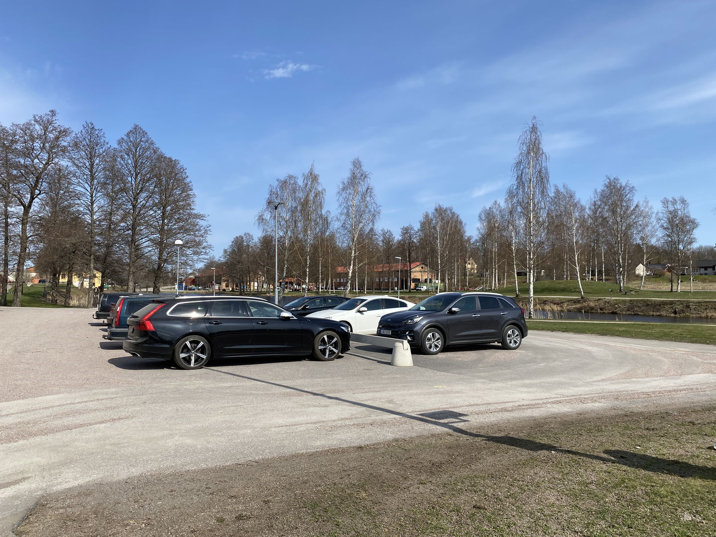 Stor asfalterad parkering intill busstationen i Österbybruk. Härifrån kan du vandra Österbybruksslingan, Upplandsledens etapp 11 mot Gimo eller etapp 12 mot Florarna.