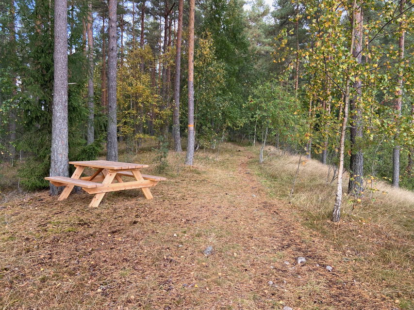 Rastplats med bänkbord uppe på Enköpingsåsen, längs Upplandsledens etapp 24.