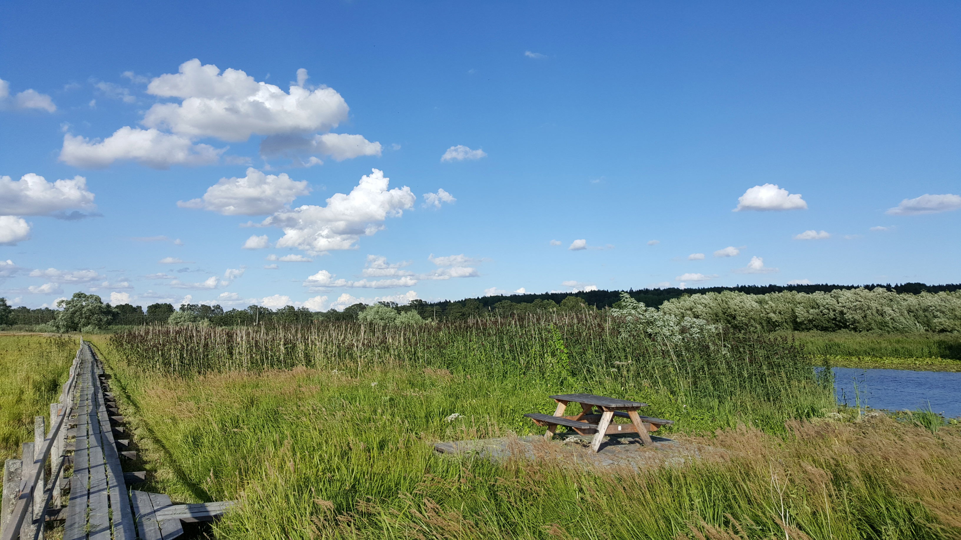 Rastplats med bänkbord vid den smala spång som går längs med ån. Vid rastplatsen har du Enköpingsån på ena sidan och en kohage på andra.