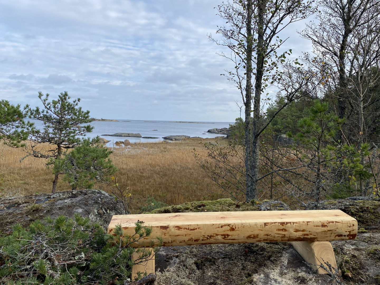 Rastplats med utsikt över Skinnbroksviken, längs stigslingan Klövtrampet.