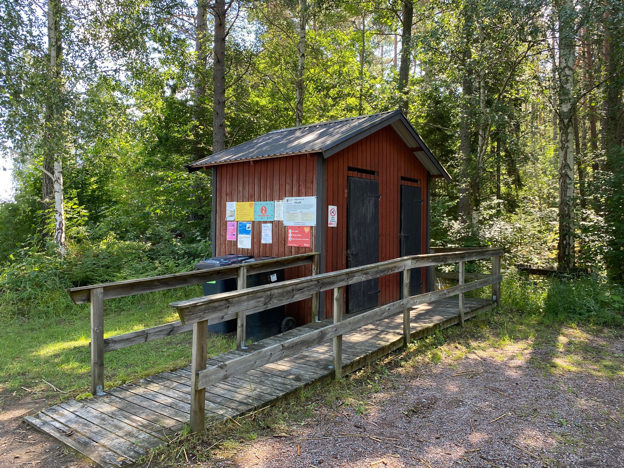 Tillgänglighetsanpassad torrtoalett nära badplatsen. Intill toaletten finns även en handikapparkering.