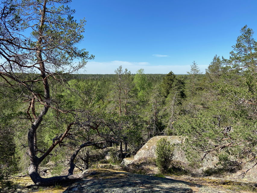Utsikt från högsta punkten på Uvhällsklack. För att komma hit följer du Upplandsleden från Tenabadet och därefter en omarkerad stig upp till toppen.