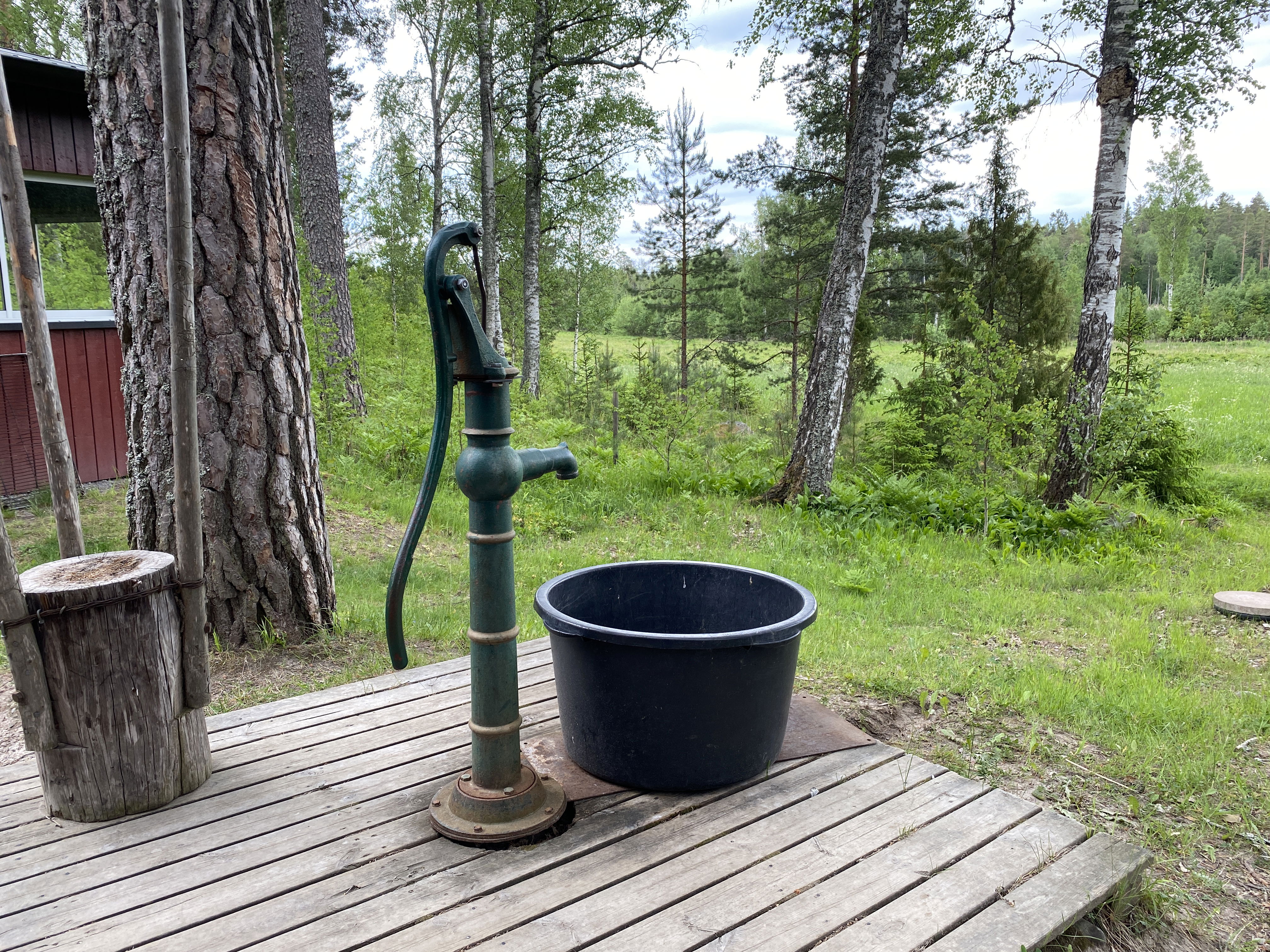 Vattenpump på gården vid den röda stugan. Vattnet ska vara tjänligt att dricka men provtas inte regelbundet. Använd på egen risk. Om det är kallt kan det frysa.