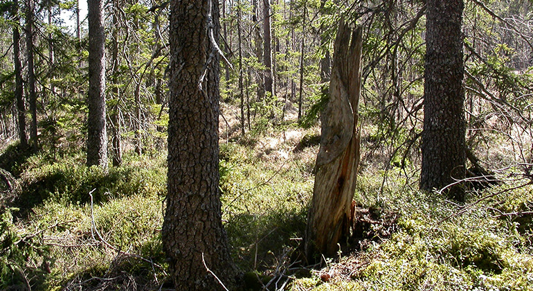 En fuktpräglad gammal grannaturskog i Norra Ny.