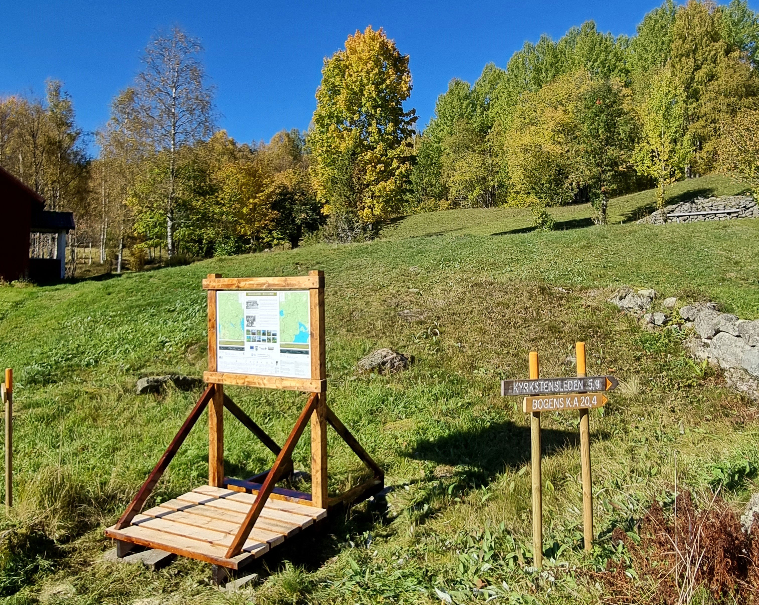Informationtavla vid ledentrén för Kyrkstensleden. Här finns även information om Norra Gunnarskogsleden som passerar förbi Lafallhöjden.