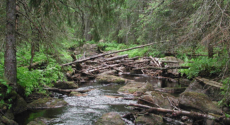 Blockrik gammal skog som omger vattendragen Långlikan och Averåbäcken.