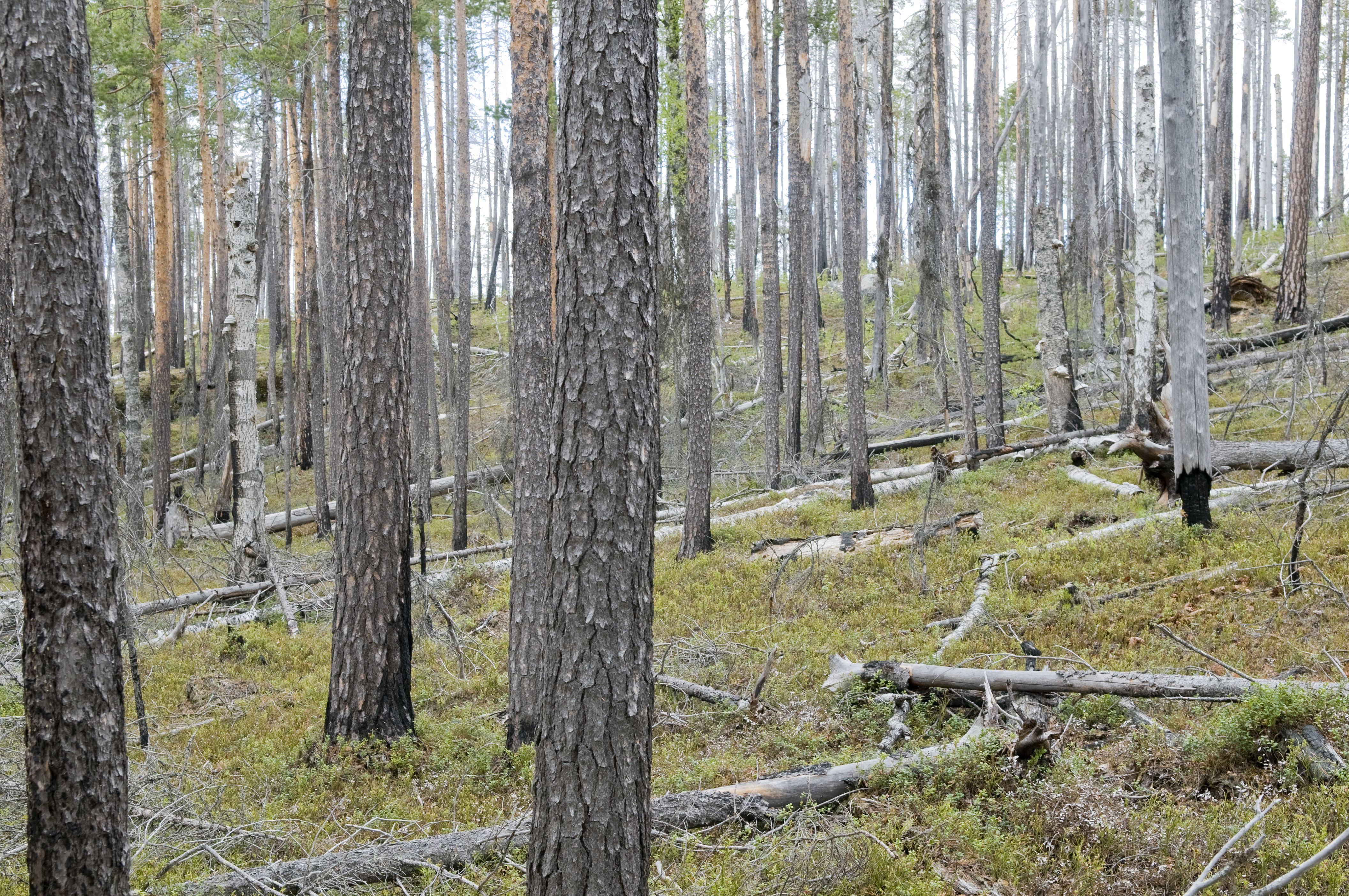 Den brandpräglade tallskogen domineras av en 150-200 år gammal trädgeneration med inslag av enstaka ännu äldre, ca 300-350 år gamla, tallar.